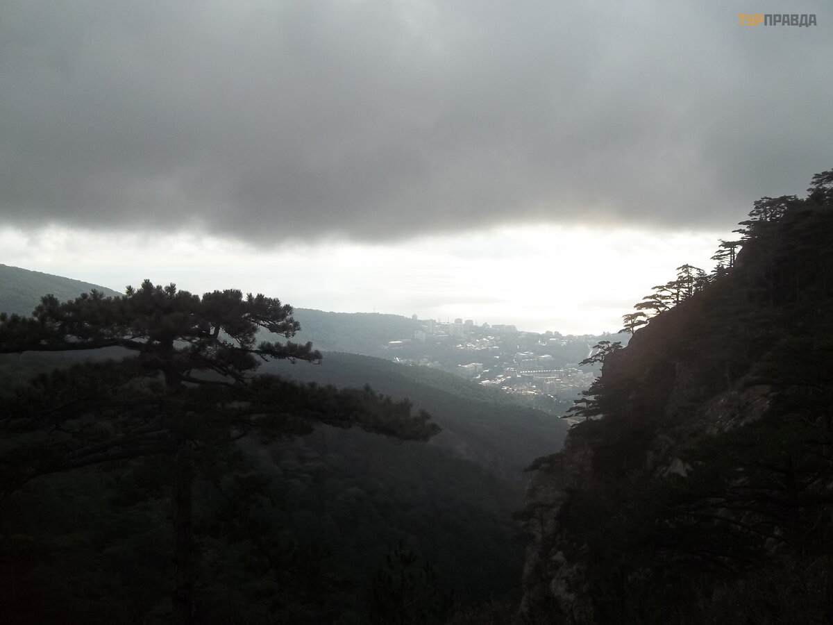 We didn't go down right away, considering that it would be too short a walk. Instead, we went up the road on the opposite slope. At the top there is an observation deck from where you can clearly see Yalta. But the weather was so-so. Clouds were creeping from the mountains, and Yalta, on the contrary, was flooded with sun. My equipment could not withstand such a contrast. The photo is so-so.