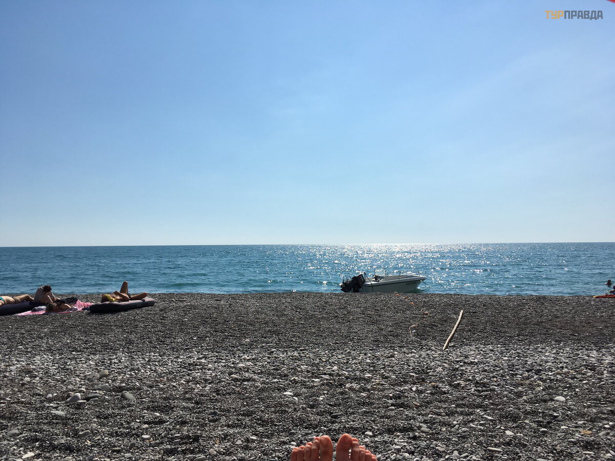 Now I'll tell you about the beach and the sea. This is something awesome! The sea, of course, is not fresh milk, but after lying in the sun, it’s the most refreshing thing! There were days when the water was just the purest, you could see your feet, and there were days when jellyfish swam and a little garbage (don't worry, just a little). At least, such a situation as in the same Anapa in the form of stinky algae was not observed. The beach is pebbly and without slippers you can’t walk on it at all, so be sure to take it with you.