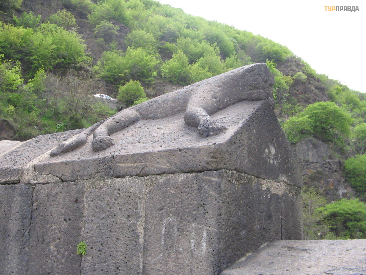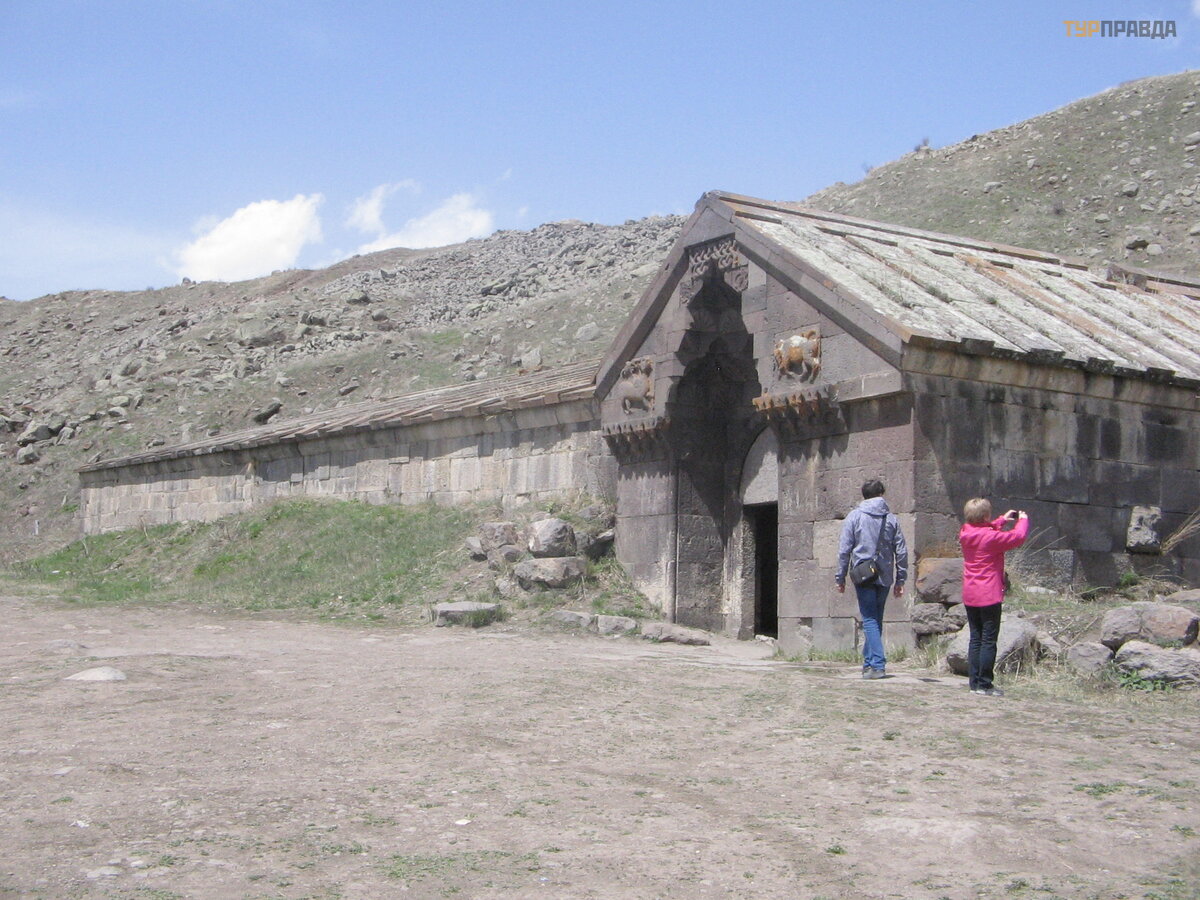 Inns were built on approximately equal segments of the path that a caravan of loaded animals (10-25 km) could cover in a day. The caravanserai existed on this site as early as the 4th century. In the XIV century, by order of Prince Orbelyan, it was rebuilt. This is evidenced by the image above the entrance of a bull and a lion with a human face in a crown and an inscription. First you get to the part where, apparently, they cooked food, because. here is the stove. From this hall there is a passage to a long hall, where animals were placed along the walls. The drovers occupied small rooms nearby, at the end of the large one. Outside, to the right of the entrance, the ruins of the chapel have been preserved.