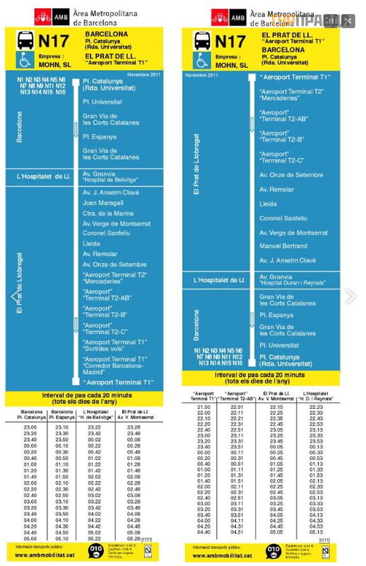 The only way to get to the airport by public transport at night is by night busN16 or N17. The N17 bus runs between Plaza Catalunya and Terminal 1, and the N16 runs between Plaza Catalunya and Terminal 2. For the N16 bus, the airport is not the final stop, so you need to carefully follow the announcements. At bus N17, the airport is the final stop. The journey takes about an hour.