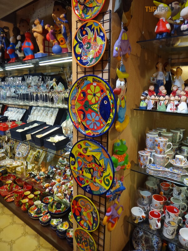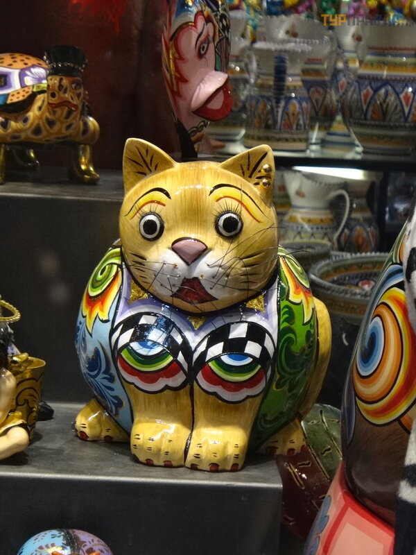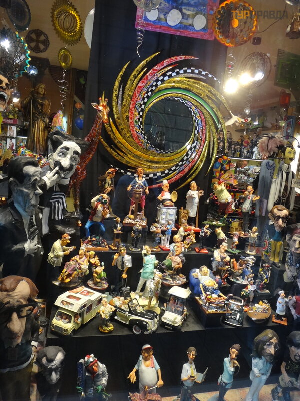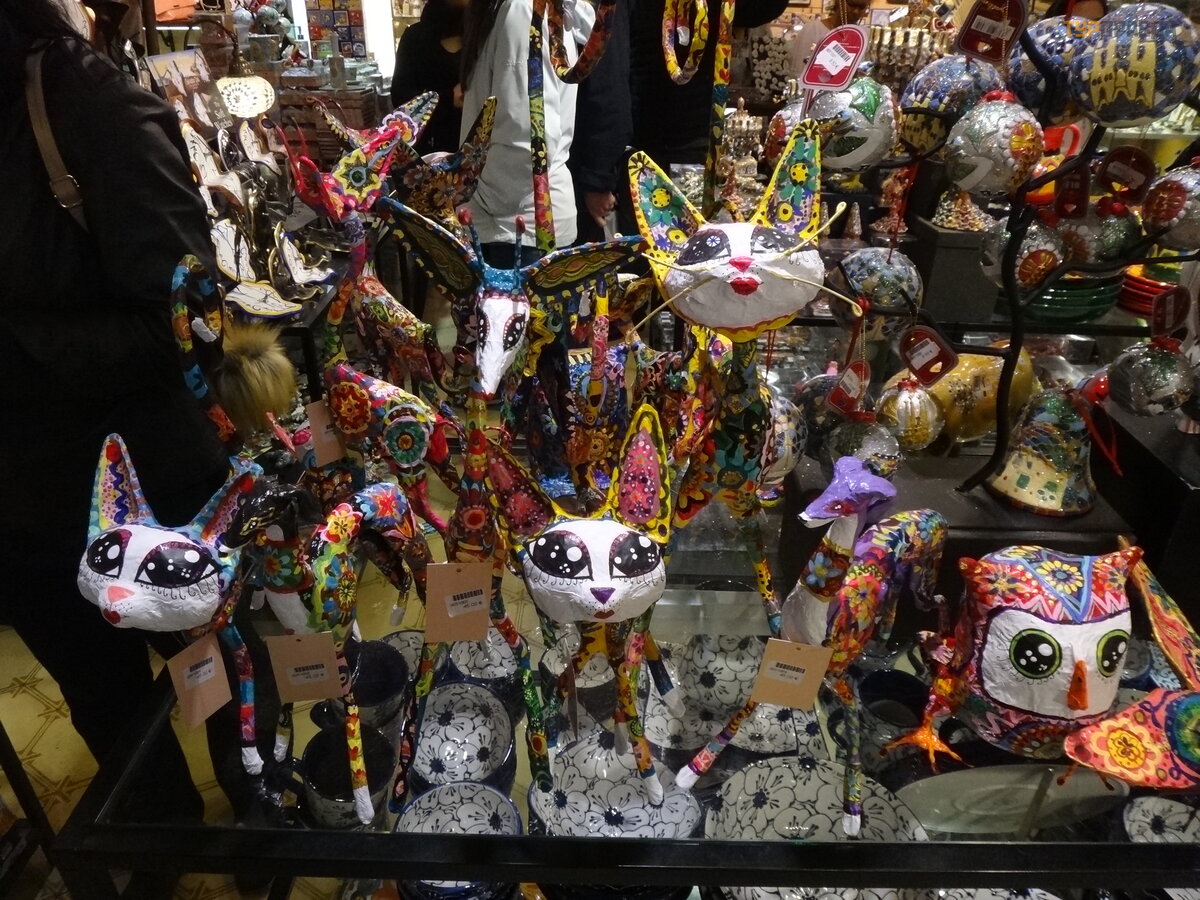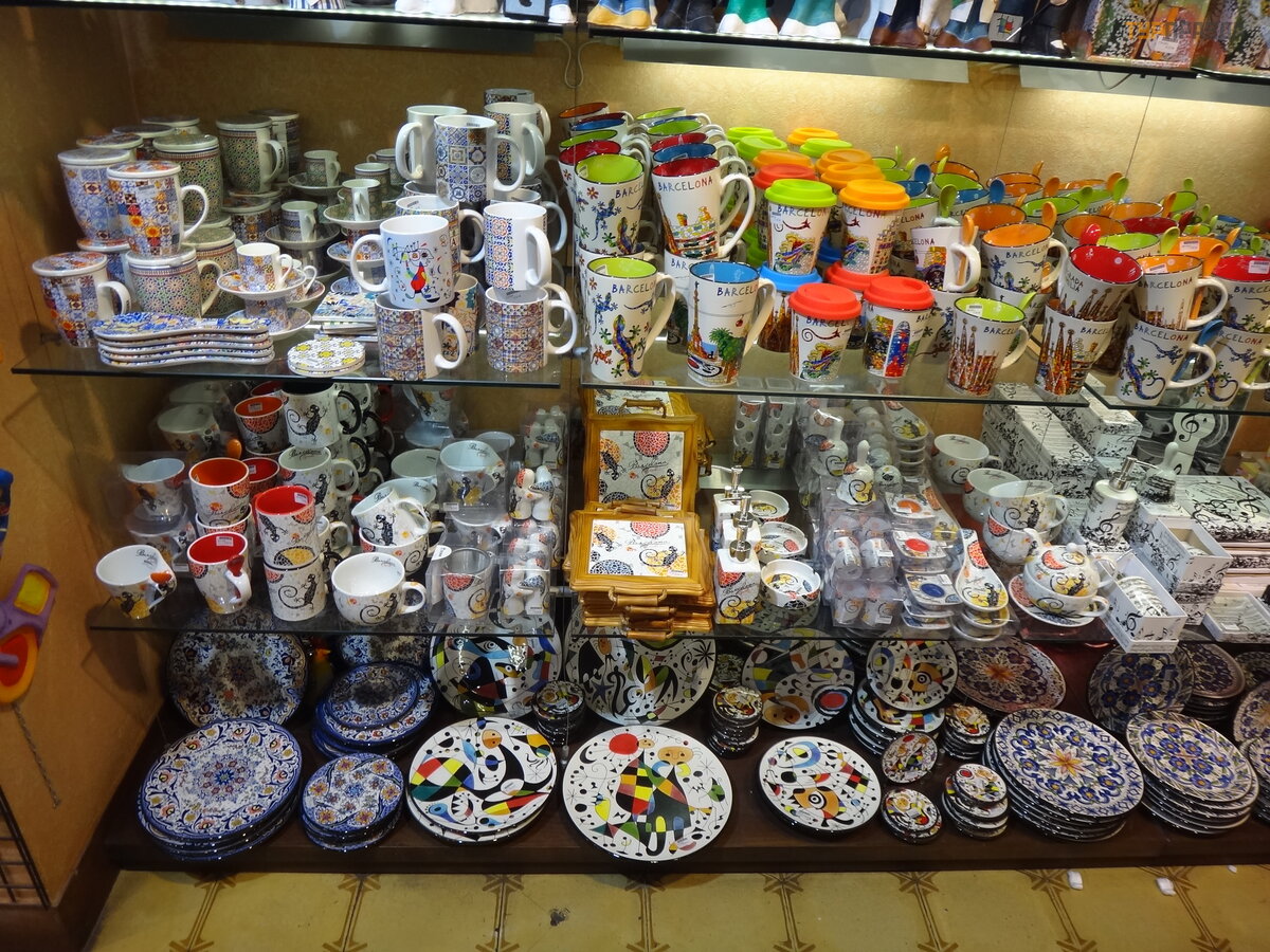 First of all, it is worth noting the pedestrian La Rambla, stretching from Plaza Catalunya to the Columbus Monument. Of course, it’s worth taking a walk along it, and it won’t hurt to get gifts for relatives and friends. Judging where it is more profitable to take something is hard. For example, I was looking for a cat figurine in the style of Gaudí . I bought it on the Rambla, and later I saw the same one cheaper near the Sagrada Familia. In outdoor tents, everything is definitely cheaper than under a roof, renting a room probably affects. We thought that they were selling Chinese junk, although what's the difference, but they have all the goods with bar codes, and everywhere excises and labels - made in Spain, which we were pleasantly surprised by.