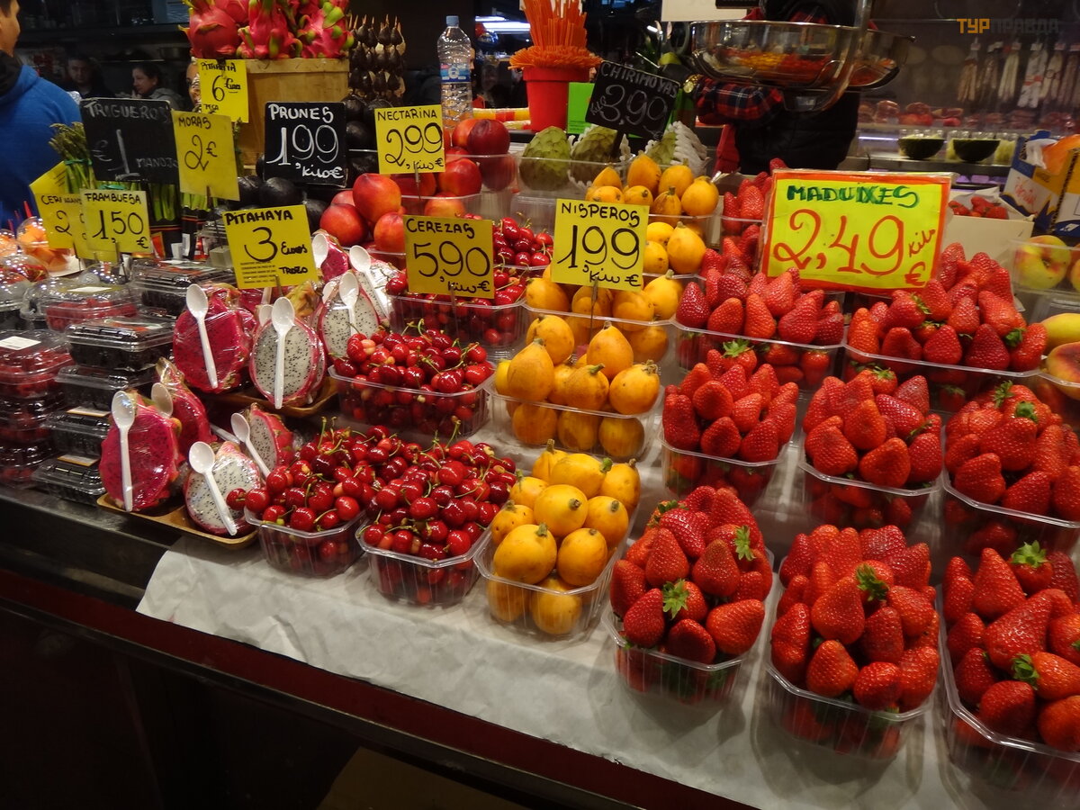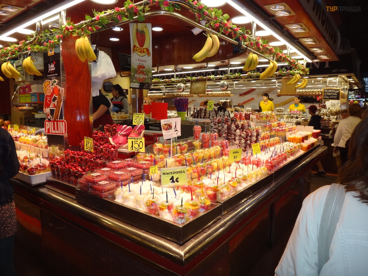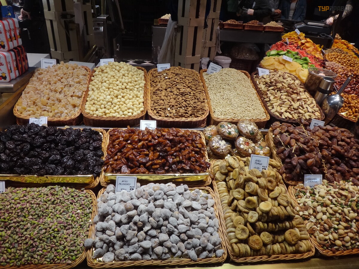 Next to the pedestrian street there is an equally famous and interesting place - the Boqueria market. Even if you are not going to take anything - just go to gawk and take pictures. The place is beautiful. And whoever thinks not only about aesthetics and new experiences, may well stock up on fresh products and, again, delicious gifts.