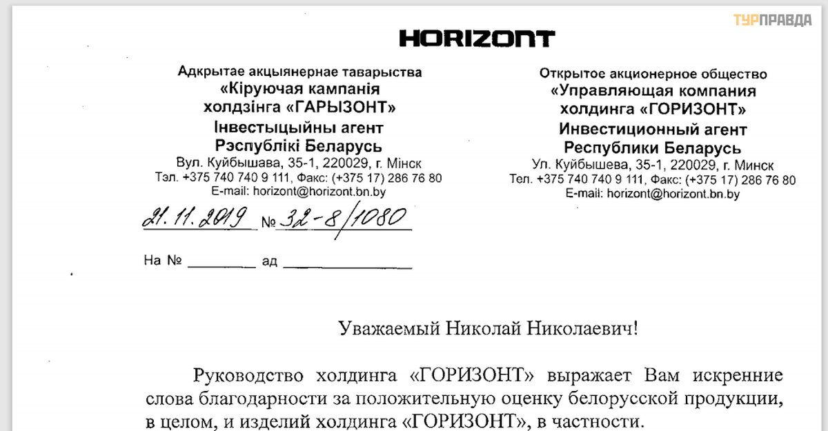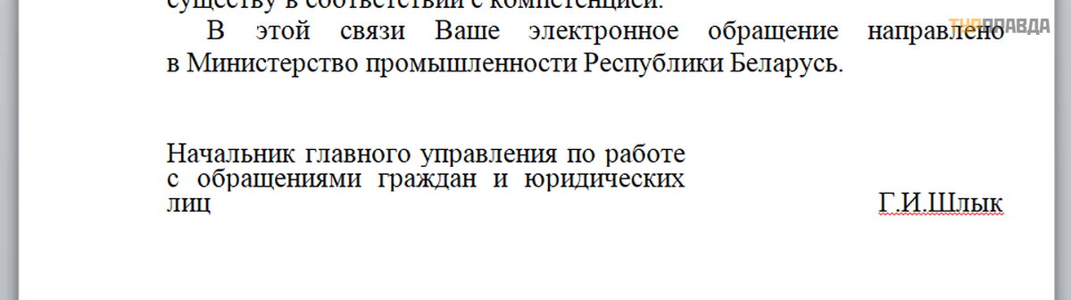 But it says thank you for everything and we send your letter to the Ministry of Industry of Belarus with a cover note.