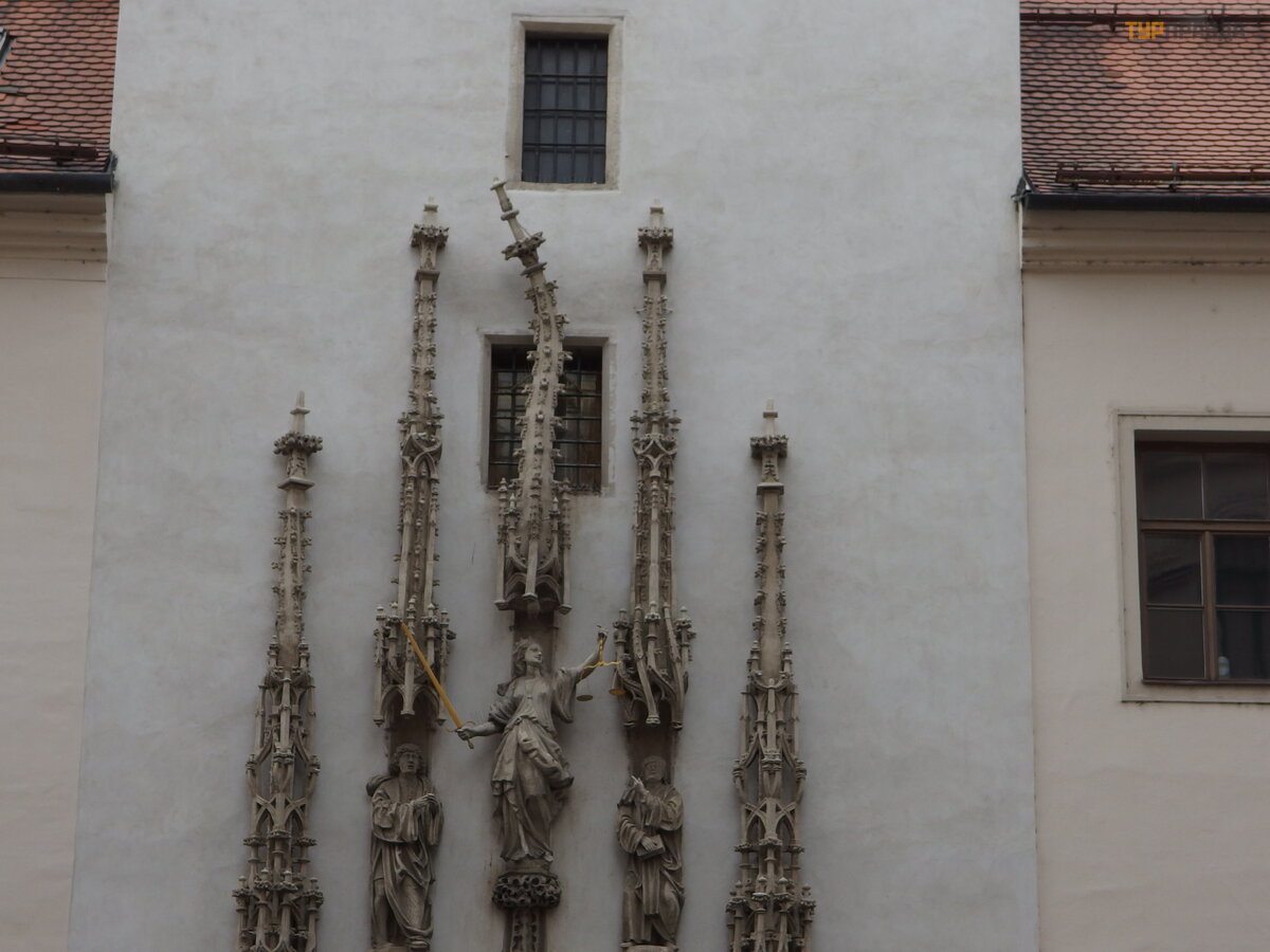 Five towers rise above the sculptures of squires and city councillors. In the center we see a female figure with a sword and scales in her hands. She represents fairness and justice. Above it is a curved tower. According to legend, the author of the sculptural group was not paid for the work, and thus he expressed his dissatisfaction.