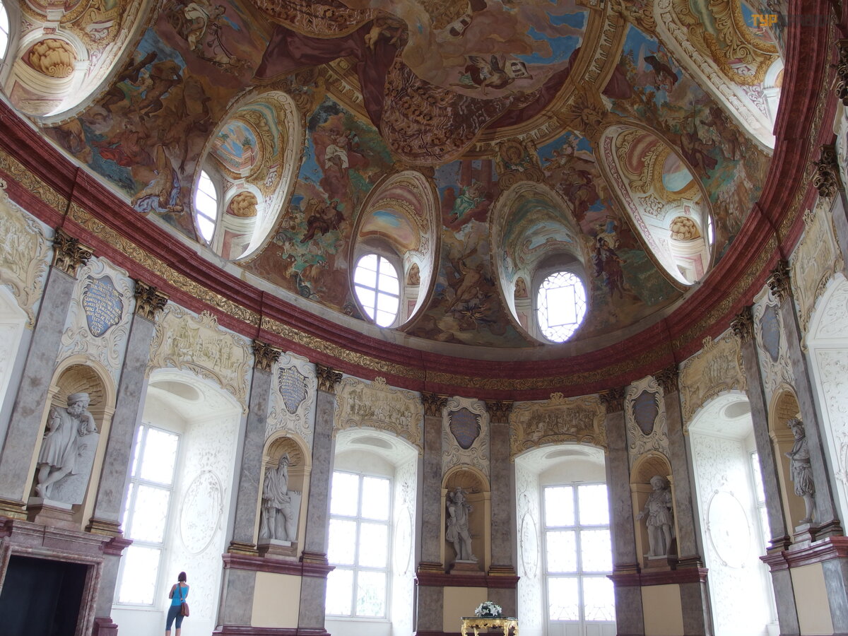 The pearl of the castle was the oval Hall of the Ancestors with statues set around the perimeter, painted plaster and ceiling frescoes by leading masters of that time.