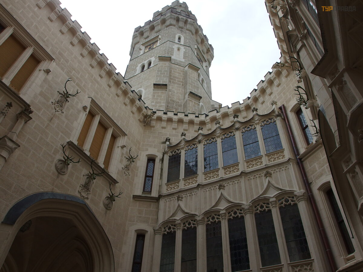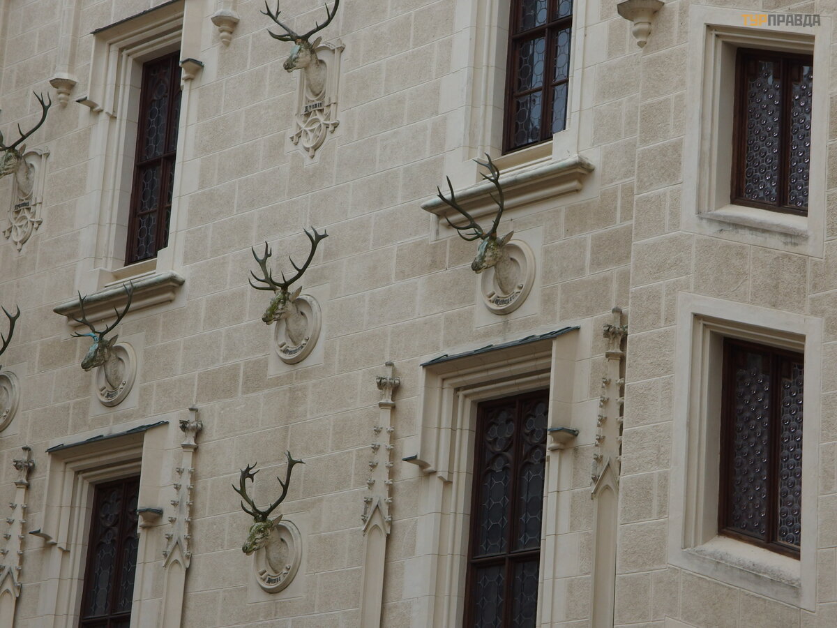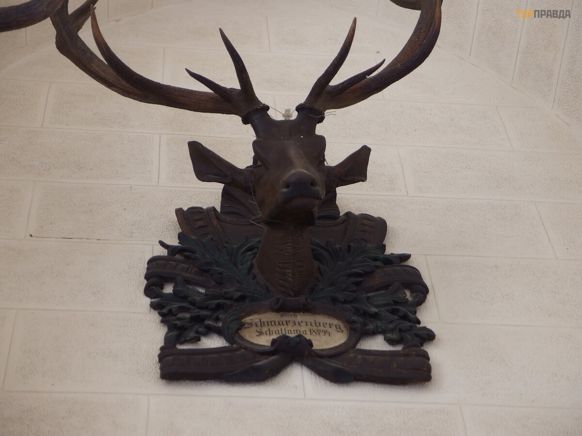 The walls of the castle both inside and outside are decorated with hunting trophies of its former owners