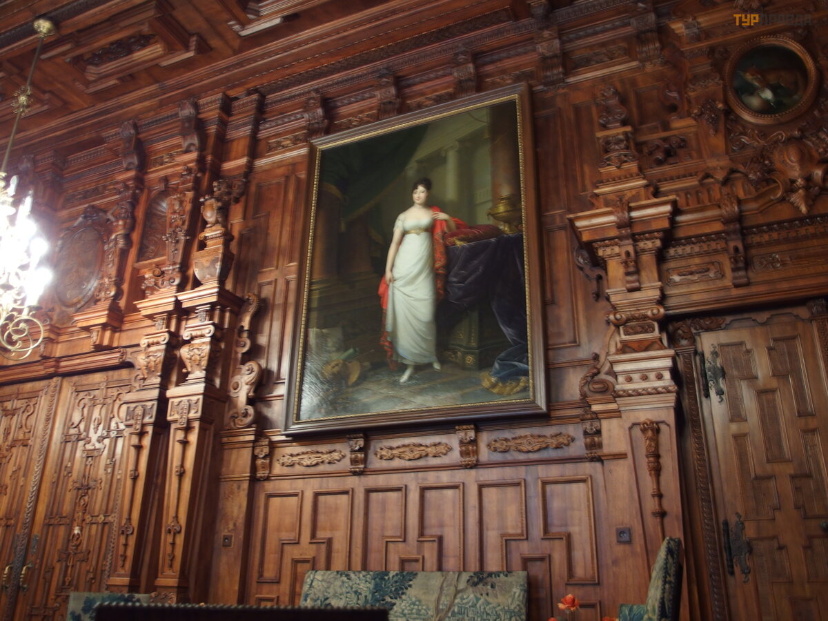 The castle exhibits furniture from the 18th and 19th centuries, a collection of Dutch paintings from the 16th and 17th centuries, historical weapons, porcelain and glassware (from 1604), as well as old tapestries. The interiors of the castle are furnished in the style of the late period of the English Renaissance. The ceilings in the castle rooms, doors, picture frames are decorated with skillful wood carvings.