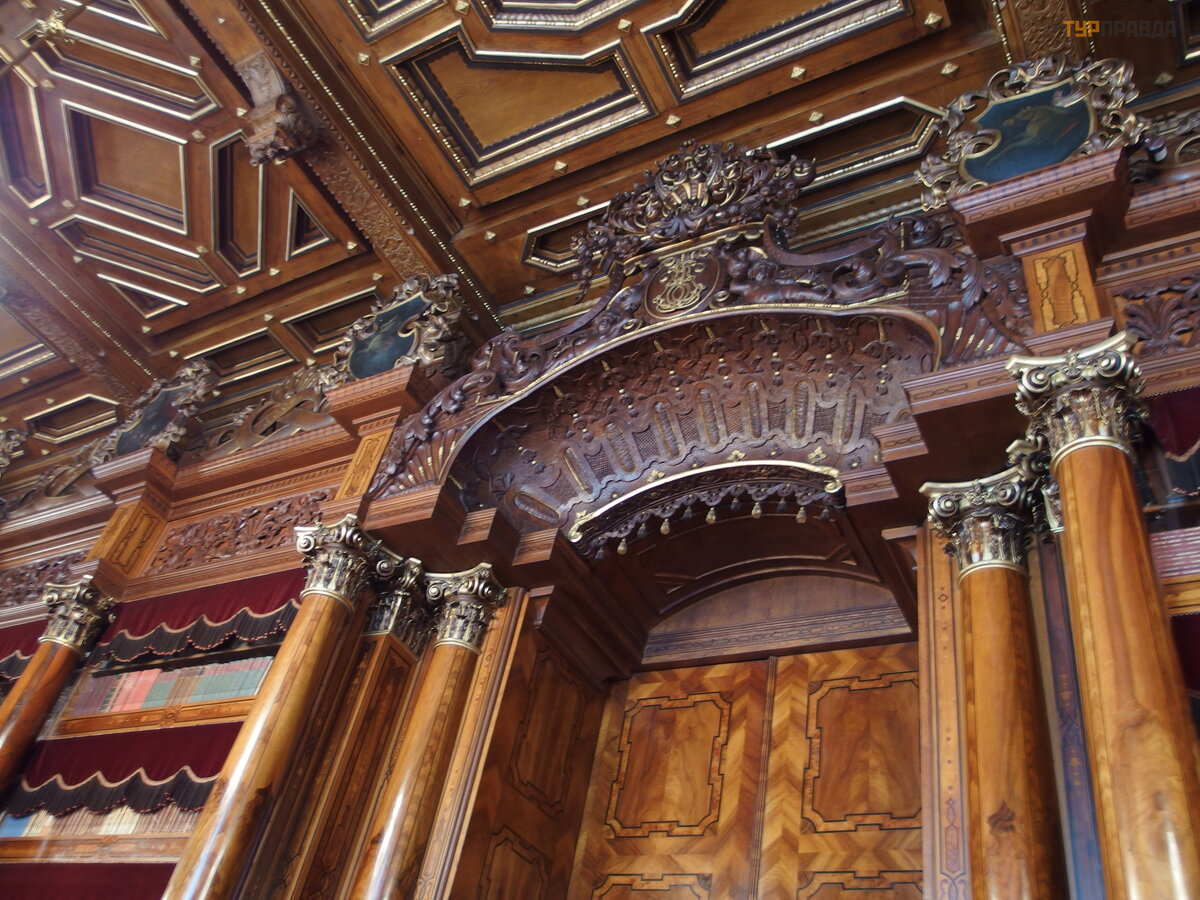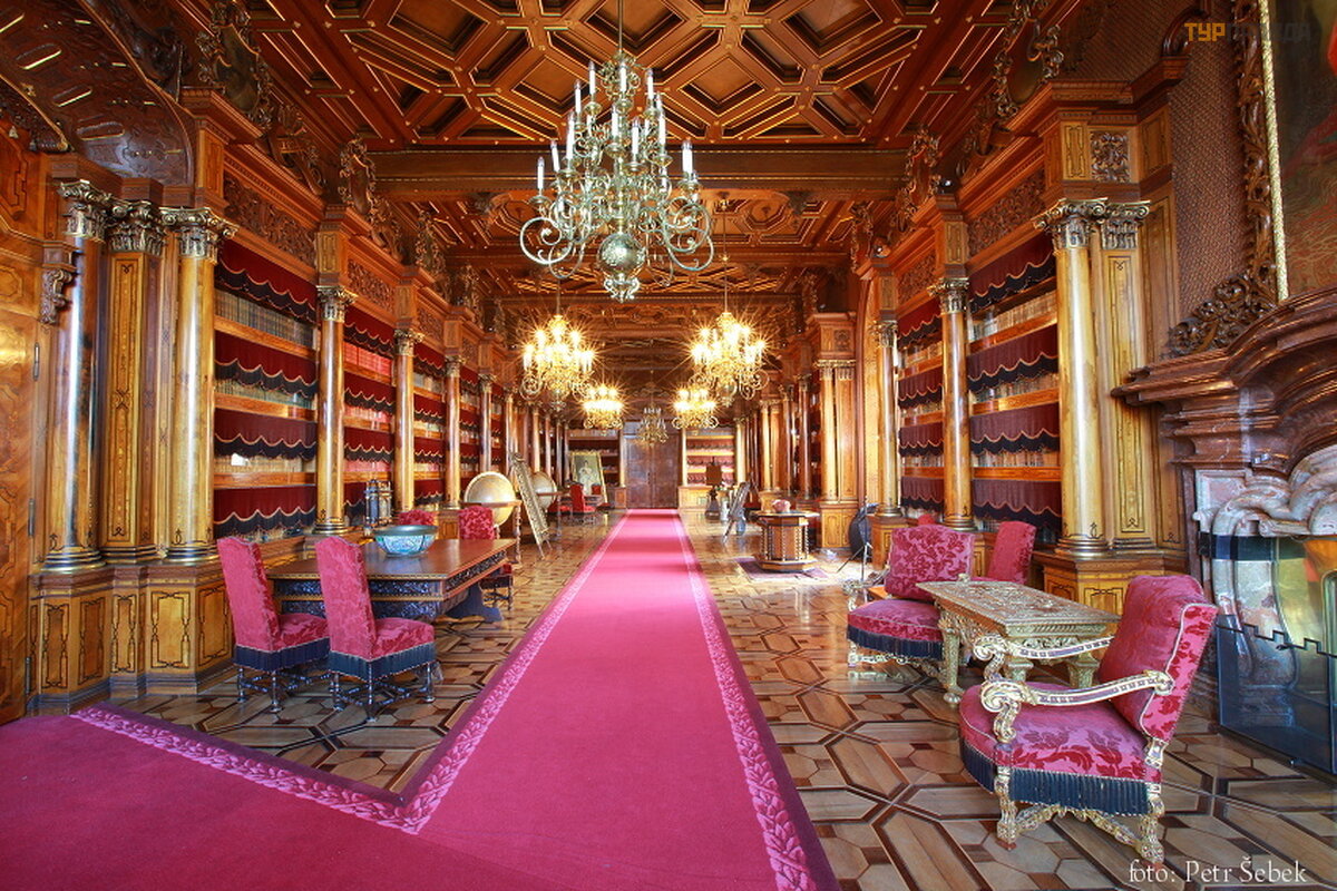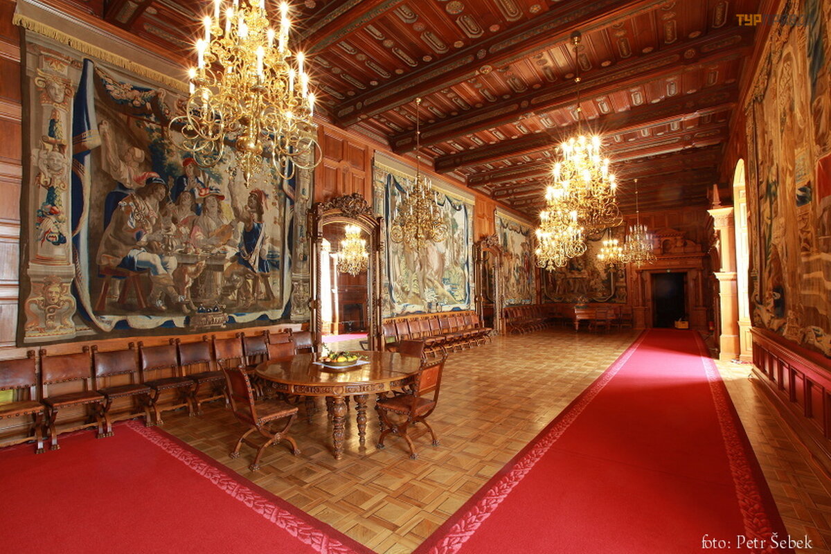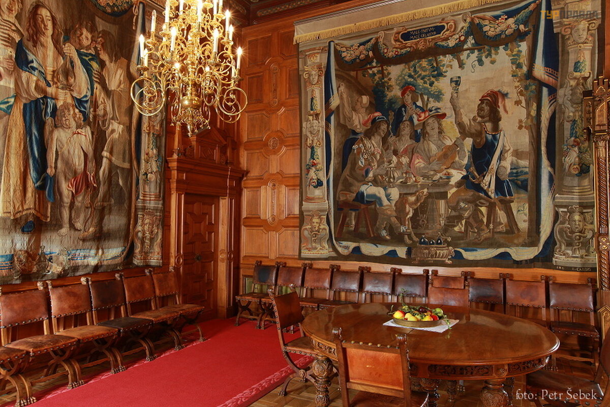 The castle has 140 rooms, 11 towers, 2 courtyards, a greenhouse, stables. We took a tour along the main route. But unlike Vranov nad Diji, here (there are many more tourists) they gather a group of 50 people (they also give out pieces of paper with text in Russian) and drive around the rooms (time 50 minutes). The interiors are just gorgeous. Finest wood carving. I would be very happy to walk a lot more time to see everything well. In general, the impression was twofold: the second time I would not go for such a run through the rooms (photos inside are prohibited, I inserted a couple of photos of interiors from their website, the windows are closed and dark for photos). But the interiors are impressive and worth a look.