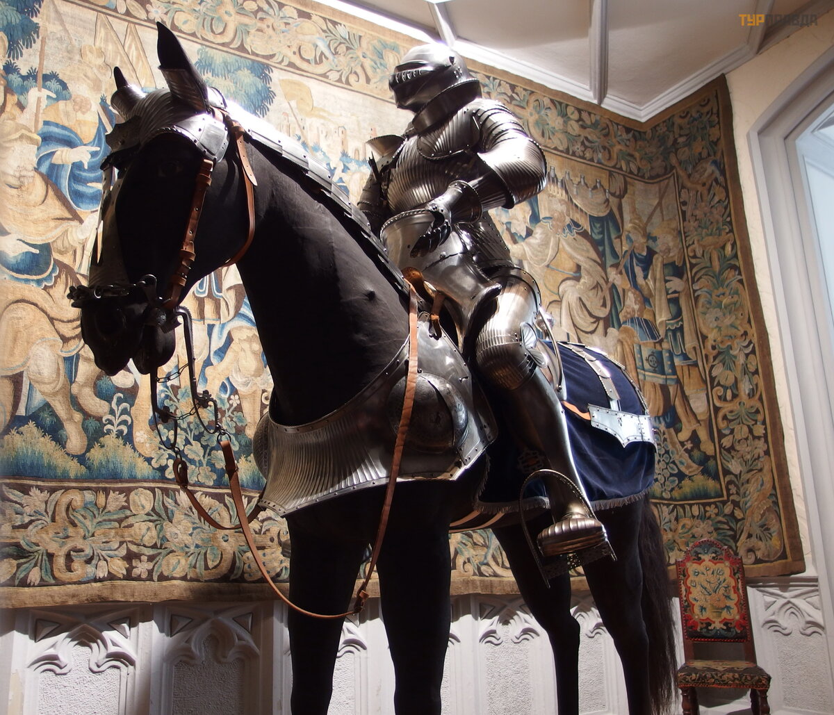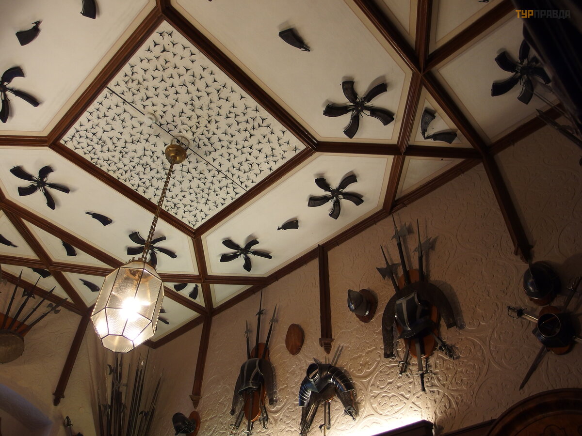 The ceiling of the hall of weapons is decorated with gunpowder horns and metal stars, which were thrown at the feet of enemy horses during battles.