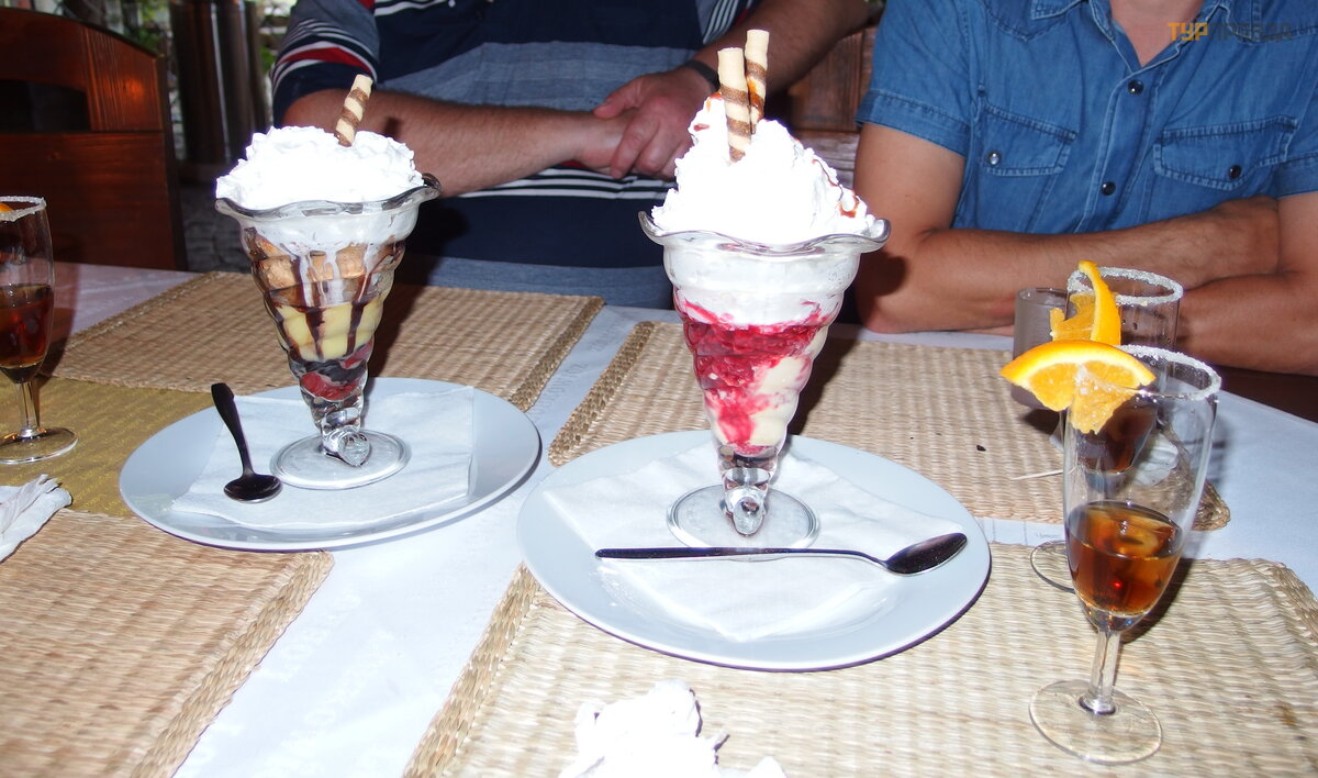 Traditional Czech dessert "Horka laska" - "hot love" ice cream with raspberries and cream. And the second dessert is the same with ice cream and cream, fresh fruit, frozen cookies, and all this "disgrace" of whiskey is poured over. A compliment from the restaurant is the national tincture "Fernet stock". We were served a lighter, softer and sweeter version (for girls : ) - citrus for dessert. Traditional Fernet has a fortress of 40 degrees. and bitter-herbal taste.