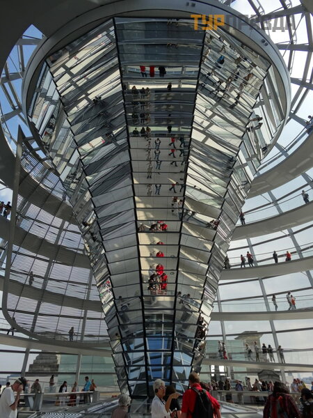 At 11-30 we went through security and got into the elevator and went upstairs. At the bottom they took a Russian book about the Reichstag, at the top they took a Russian booklet, a photo panorama of buildings that can be seen from the dome. Plus, we were given Russian audio guides that work depending on the location.