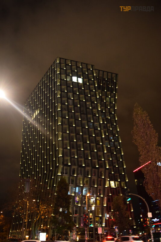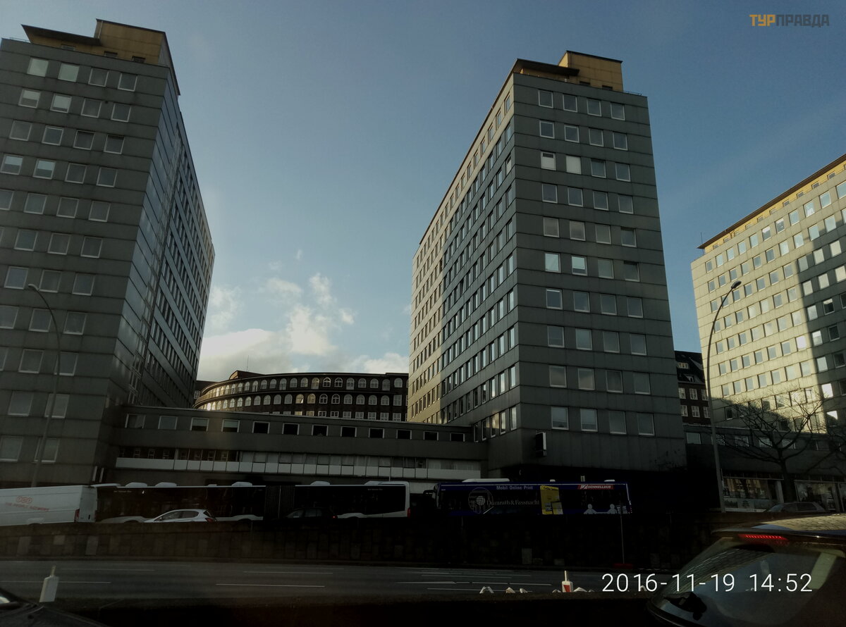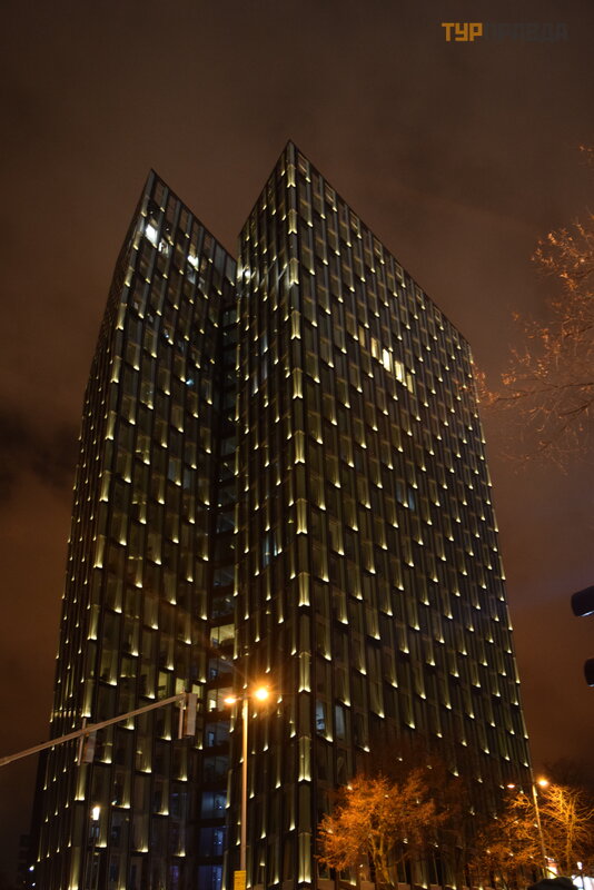 On the way to the Red Light District, we met - this is such an office center - or rather there are two of them, Two dancing towers. They are located on the street Reeperbahn-90 m high. It's beautiful, like they're dancing the tango.