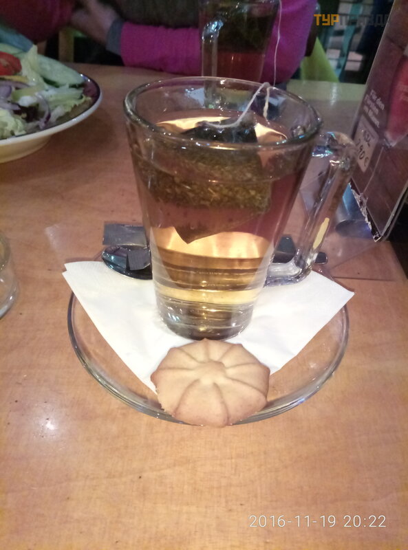 It was already cold for a walk, the breeze picked up, we shuddered and went into the cafe next to our hotel. And it costs almost three euros! The Germans everywhere and everywhere repeat that everything is expensive for them. But then even we were stunned, we bring tea in teapots and custard, and here is a bag, but as our Germans said, it’s made of fabric!