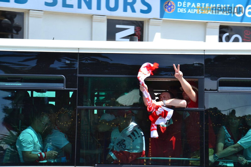 И вот мы въезжаем на Promenade des Anglais: лазурное море, солнце, пальмы, заполненные пляжи. Немного настораживают люди в бело-красных одеждах. Делаю логическое заключение – это поляки. Неужто кто-то играет в Ницце? Отбрасываю от себя эту мысль. Но «красно-белых» становится все больше. К ним же присоединяются и «зеленые».