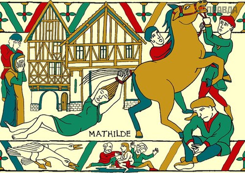 По приказу герцога ее привязывают к лошади и протаскивают по мостовой.
