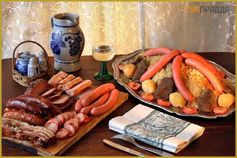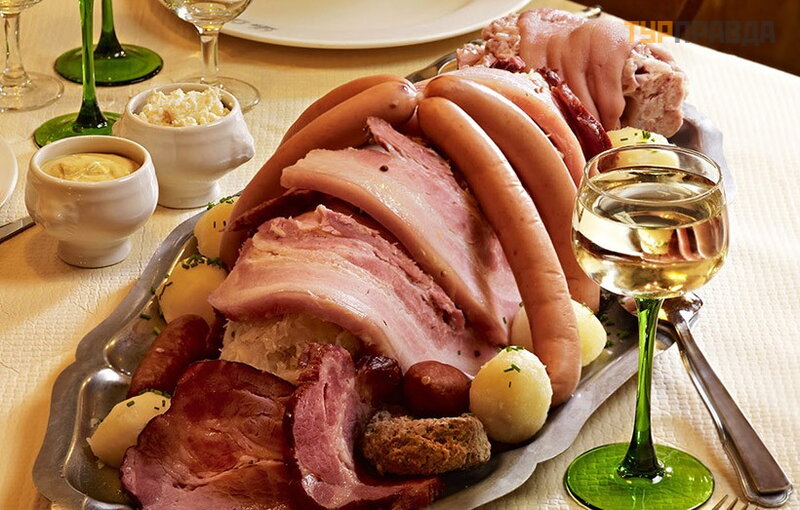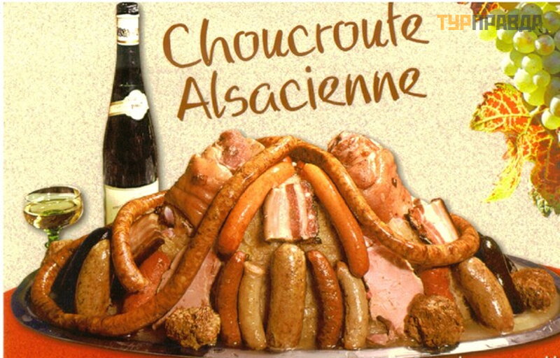 Эльзас – пограничный край, где смешались германская и романская культуры. С  одной стороны, германская практичность, а с другой – французская элегантность в очень больших размерах))) Одна из первых ассоциаций со словом Страсбург – страсбургские сосиски и ветчина. А если хочется поесть по-серьезному – то это, конечно, шукрут. Известный и любимый во всей Франции. Жители Эльзаса на всю страну славятся своей кухней. Шукрут – это картофель, капуста, сосиски, колбаски и ветчина. Ешьте на здоровье!  Bon appétit! Захватите с собой Панкреатин)
