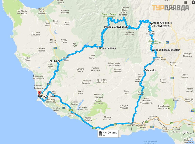 1. За 25 евро: деревня Омодос с монастырем Святого Креста, монастырь Святой Девы Трикуккья (Теотокос), монастырь Киккос, монастырь Хрисороятисса. Продолжительность 9 часов.