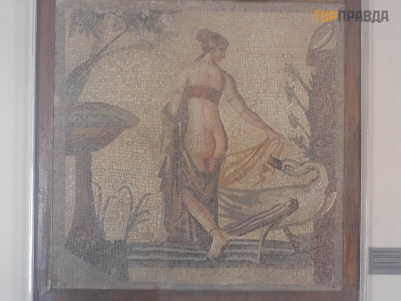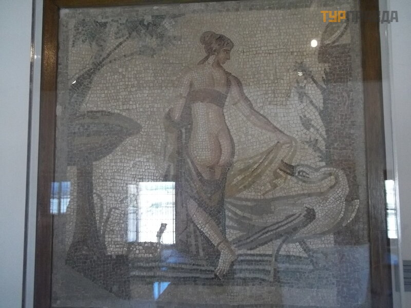 Больше всего нас интересовала сохранившаяся мозаика «Леда и лебедь» (в образе лебедя – Зевс). О ней до самого посещения музея мы не знали, оригинал в Куклии или копия? А если копия, то где оригинал? Оказалось, что оригинал – в этом музее. Очень трудно было эту мозаику сфотографировать, окно попадало в кадр:
