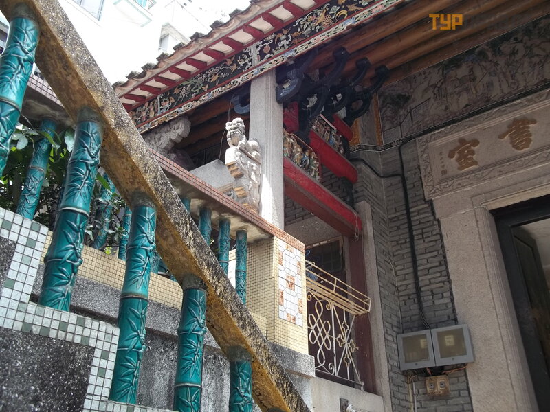 Этот дом мы потом долго рассматривали. Он каким-то образом совмещен со входом в Учебный зал Shut Hing. Очень оригинально: по обе стороны коридора, ведущего ко входу, симметрично расположены лестницы: