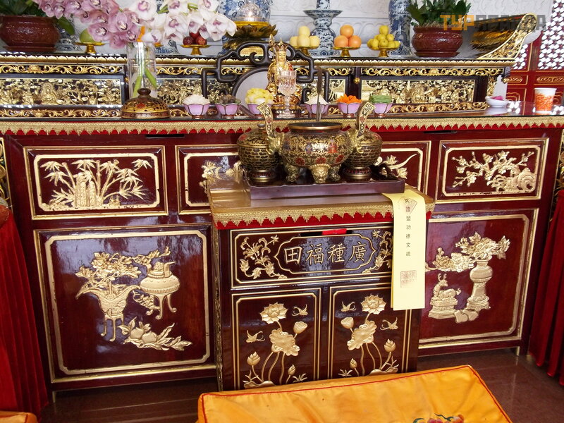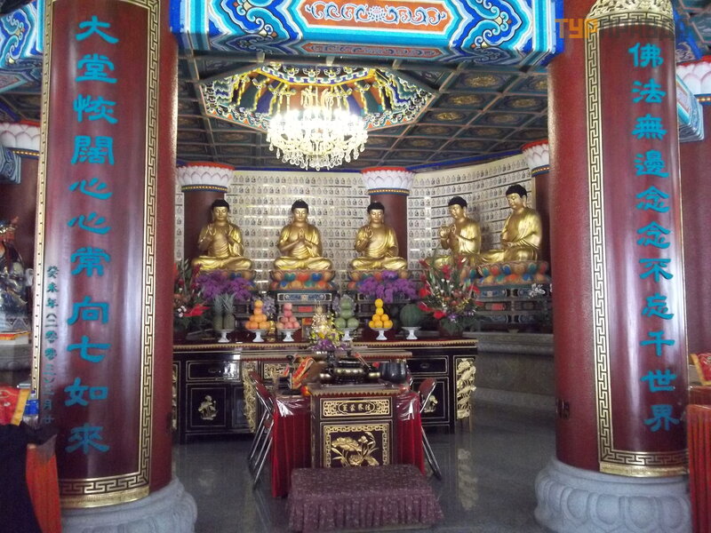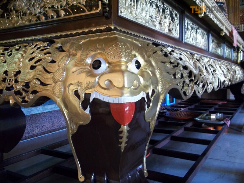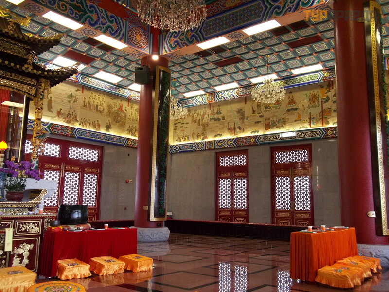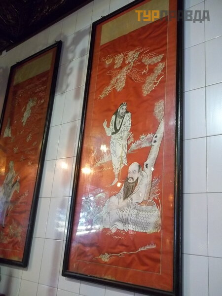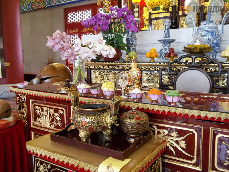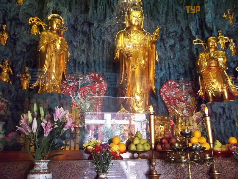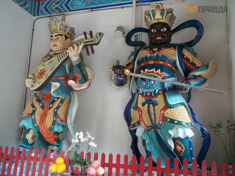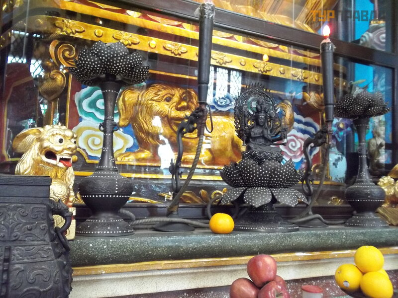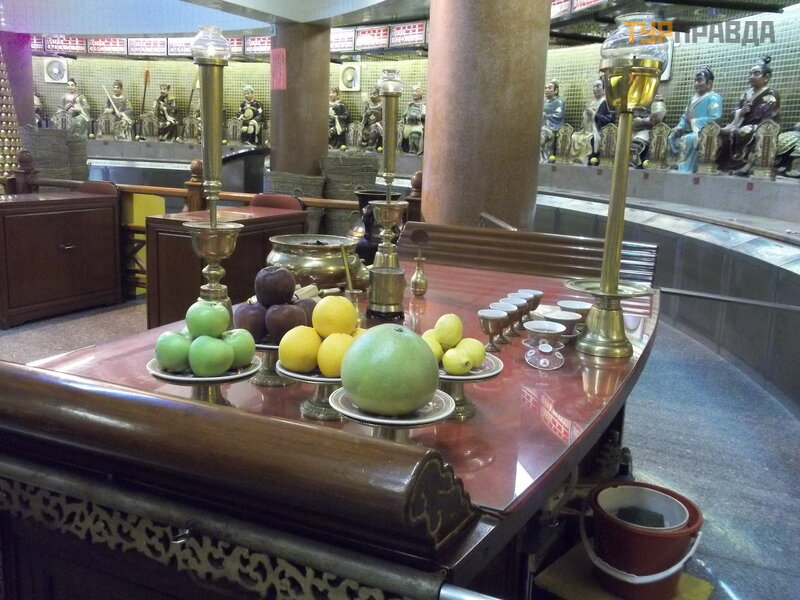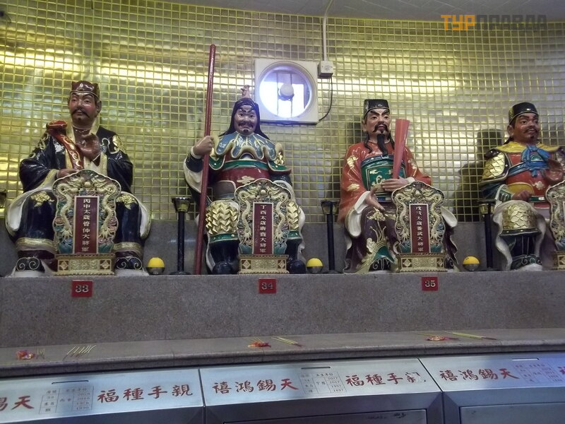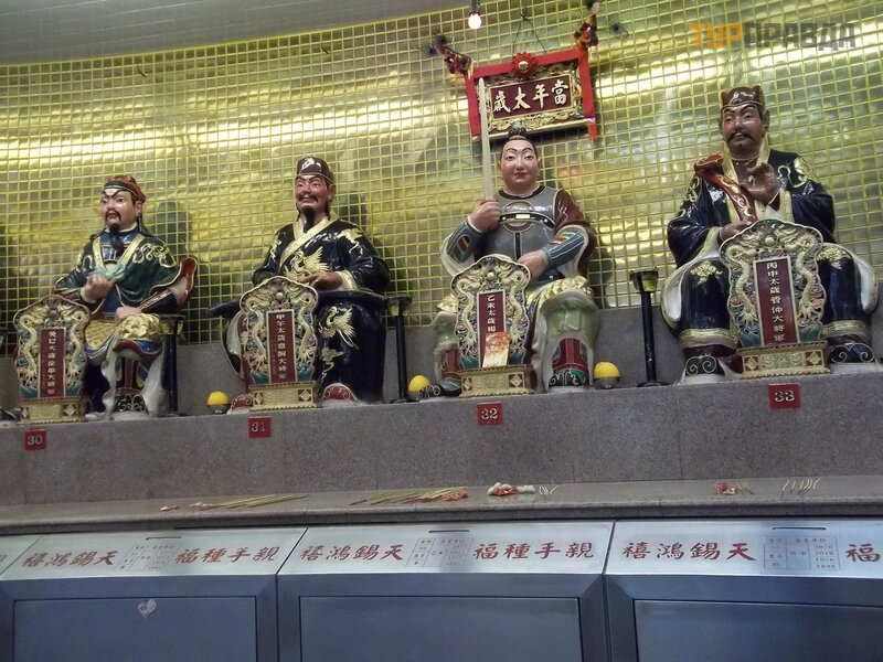 А вот нижний зал главного храма особо интересен. Сюда приходят молиться и делать подношения своему покровителю – одному из 60 воплощений даосских святых, расположенных по кругу: