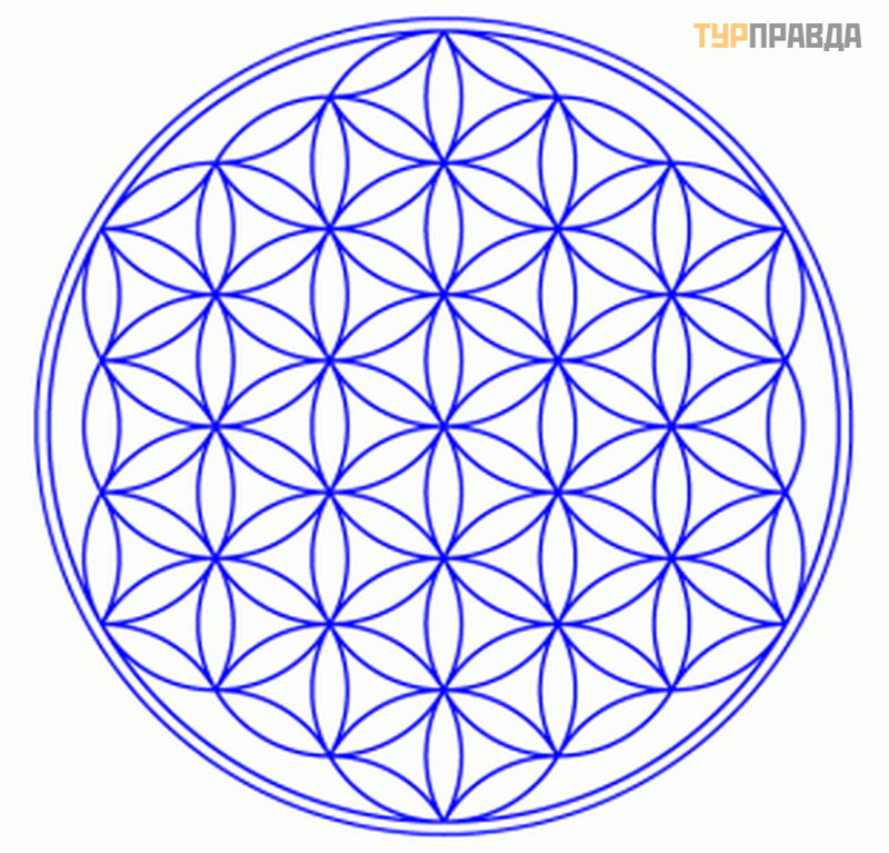 Немного о львах. Традиционно справа и слева – львы, охраняющие вход в храм. Львицу на предыдущем снимке не видно (она обычно изображается придерживающей лапой львёнка), а стилизованный лев держит в лапах большой шар (обычно шар поменьше, и лев держит его одной лапой). Шар «в буддистской традиции трактуется как сокровище, символ буддийского знания, несущий свет во тьму и могущий исполнять желания.» Шар, дающий энергию для великих свершений, часто изображается с узором "цветка жизни". Дальше – больше: «Цветок Жизни - это простой геометрический узор, заключающий в себе все тайны мироздания.» Выглядит этот узор как-то так: