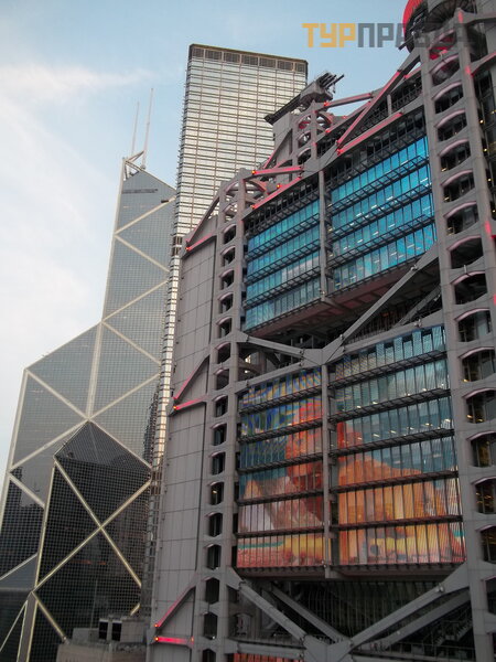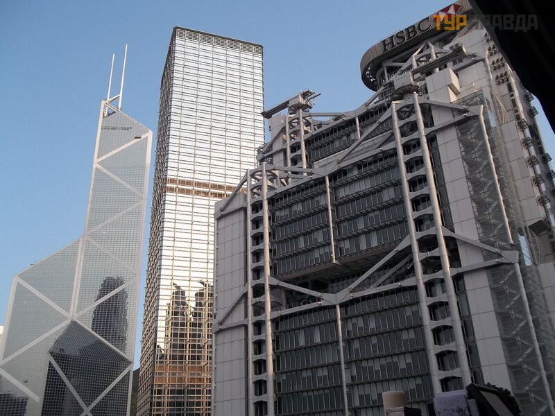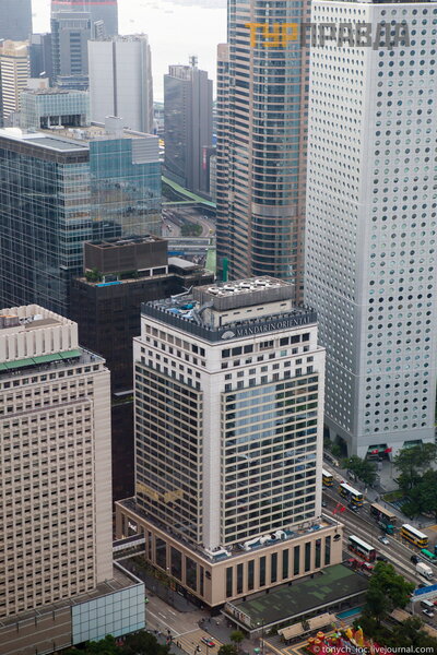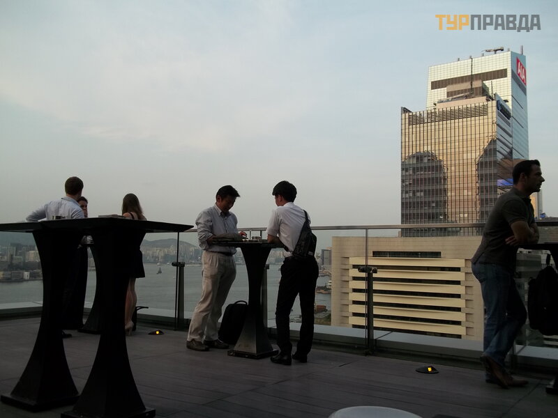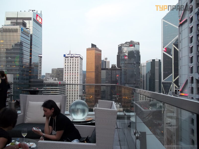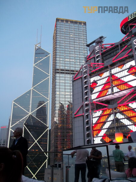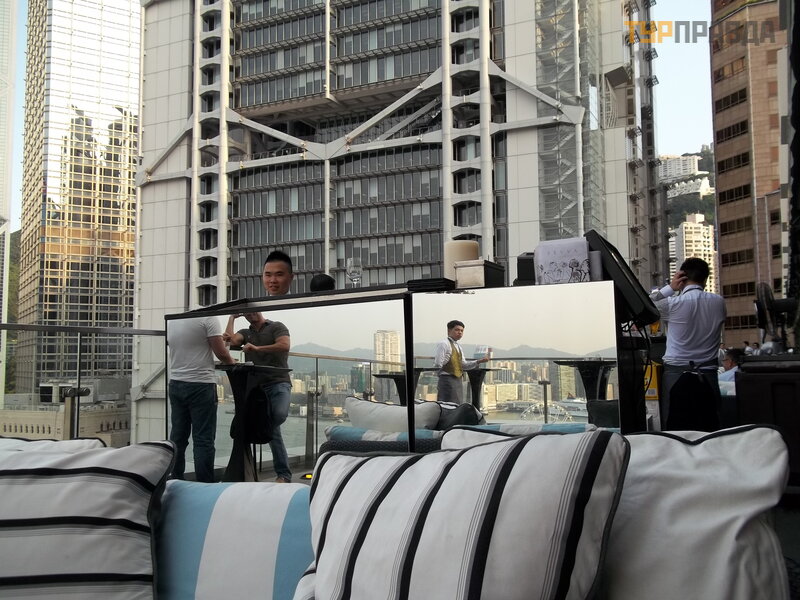 А вот одно из моих самых любимых мест в Гонконге – бар «Sevva» на 25-ом (всего-то) этаже 29-ти этажного Prince's Building. На этом (не моем) фото – два «карлика», построенные в середине 60-х годов 20 века на площади Статуй: справа – отель «Мандарин Ориентал», слева - Prince's Building (офисы и торговый центр). Хорошо видно соединяющую их галерею и бар (там, где тенты):