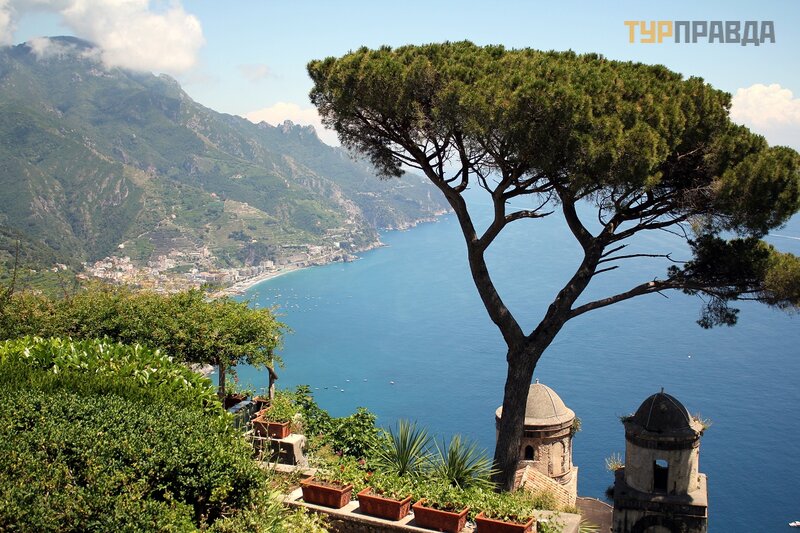 Отправляемся за открыточными видами: сосна на фоне моря и старинного собора - визитная карточка виллы Руфоло. Да сколько угодно  таких видов, с разных ракурсов!