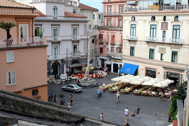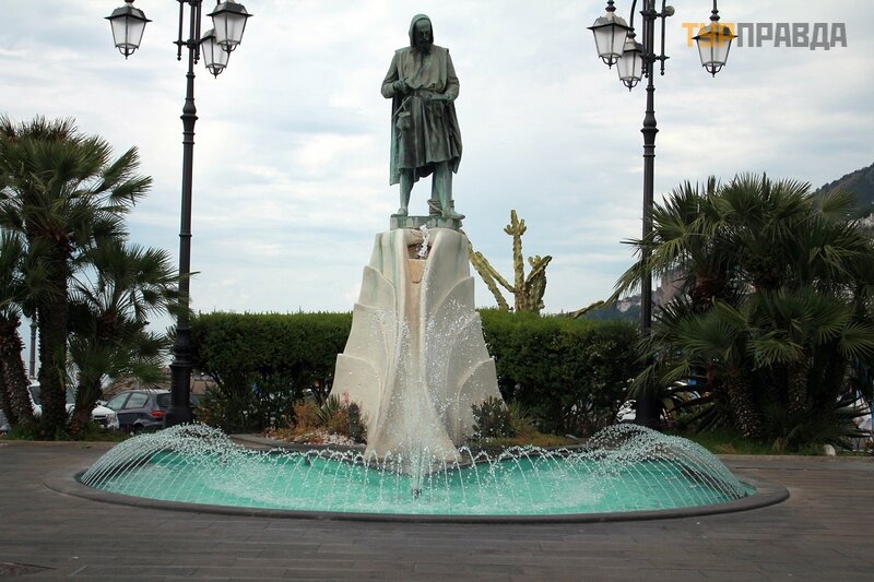 Здесь курортная жизнь можно сказать кипит и бурлит по сравнению с полусонным Майори. Выходим на единственную прямую улицу Амальфи - Via Lorenzo di Amalfi. В самом начале улицы на площади перед собором расположен фонтан, украшенный скульптурой Апостола Андрея Первозванного.  Около него почти всегда толпятся люди, наверное просят о чём - то.