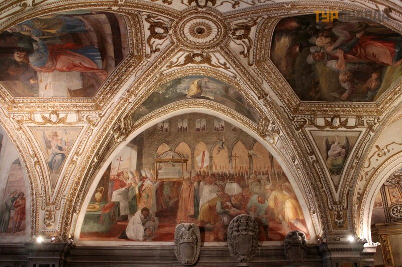 Часовня в конце «райского дворика» ведет в еще более древнюю базилику (IX в.) - Базилику Распятия, построенную в романском стиле. В этой части собора в настоящее время размещен музей, где представлены саркофаги, скульптуры, изделия неаполитанских ювелиров и другие сокровища кафедрального комплекса.