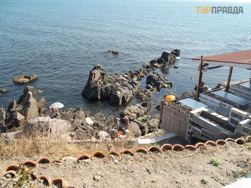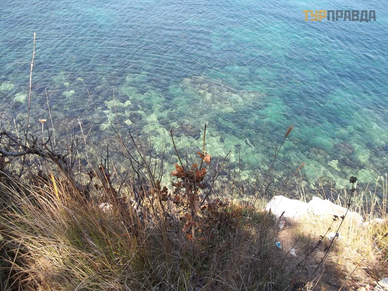 По берегу не получается. Сначала надо идти по дороге. Это не трасса, но машин много, потому что суббота. Потом, приблизительно на расстоянии 2 км от остановки паровозика, можно свернуть на тропу, которая проходит по обрыву над морем:
