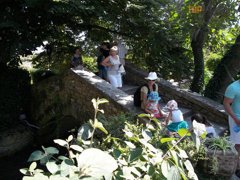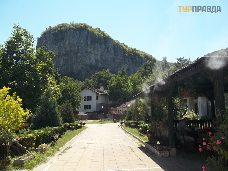 При монастыре есть очень симпатичный ресторанчик, где мы обедали. На снимке справа – это он. То, что похоже на дым, – это искусственный туман для охлаждения воздуха. Очень приятная штука: