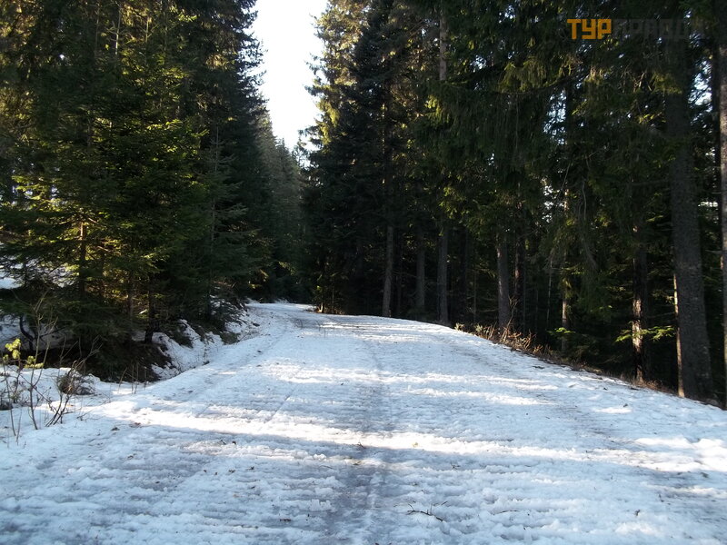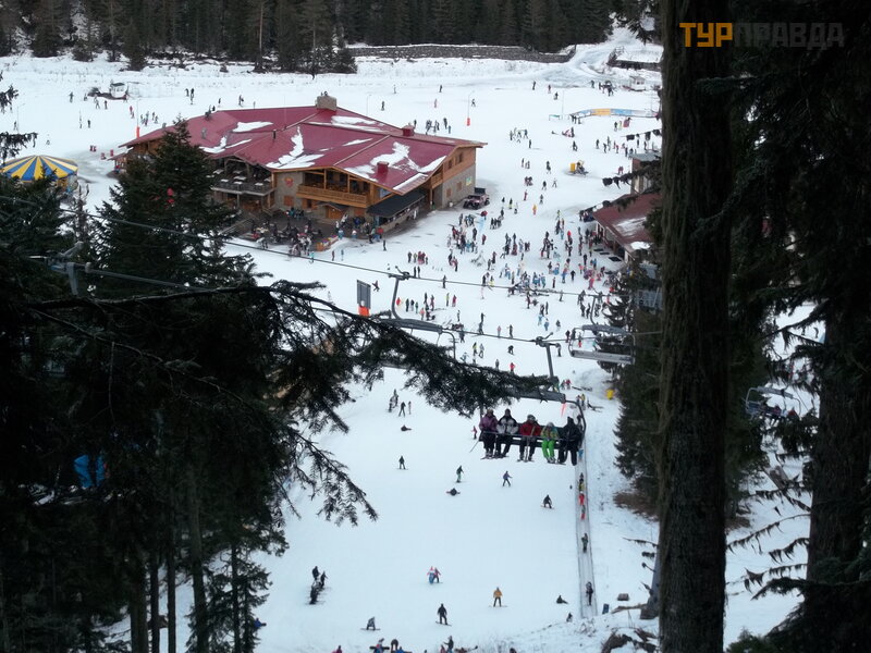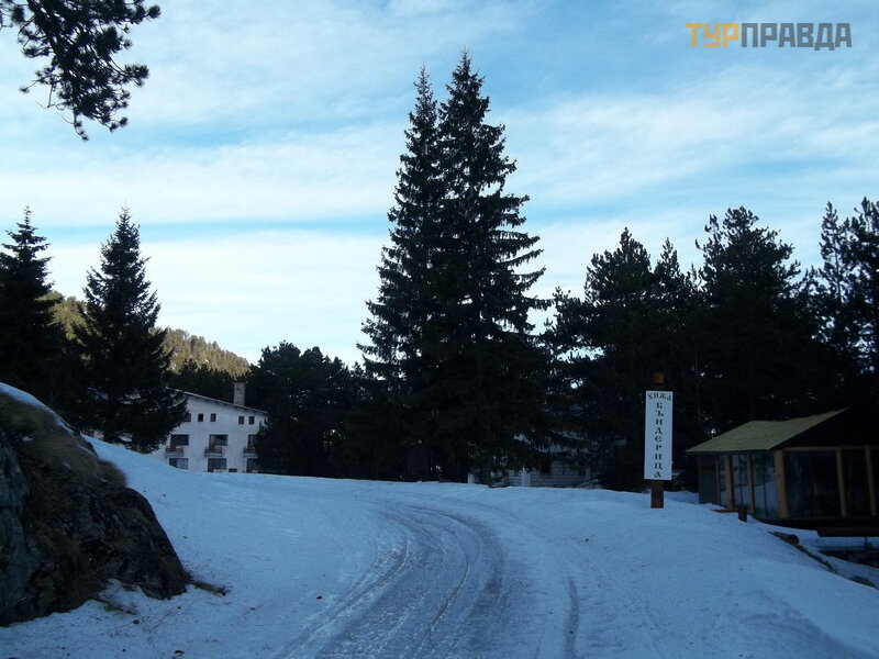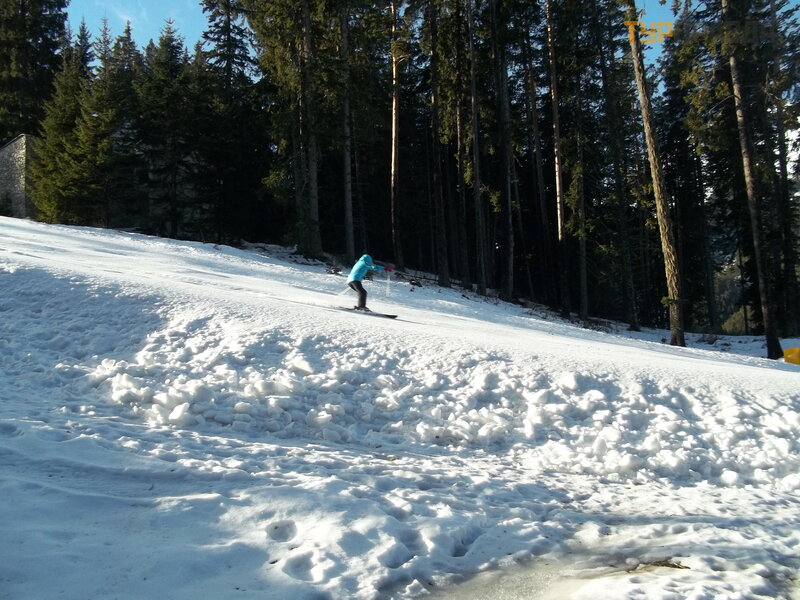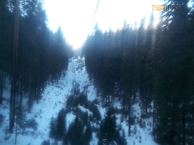 Главное, ради чего вся поездка – горы. Туда можно, конечно, ходить пешком. Но внизу лужи, а снег наверху, до него километра три. Все горнолыжники поднимаются до трасс на восьмиместной гондольной канатке («кабинков лифт»). И я решила с утра так сделать. Цена около 30 лв (один раз вверх-вниз). Начало работы поздновато – 8:30. Тем более, что зимой короткий световой день.