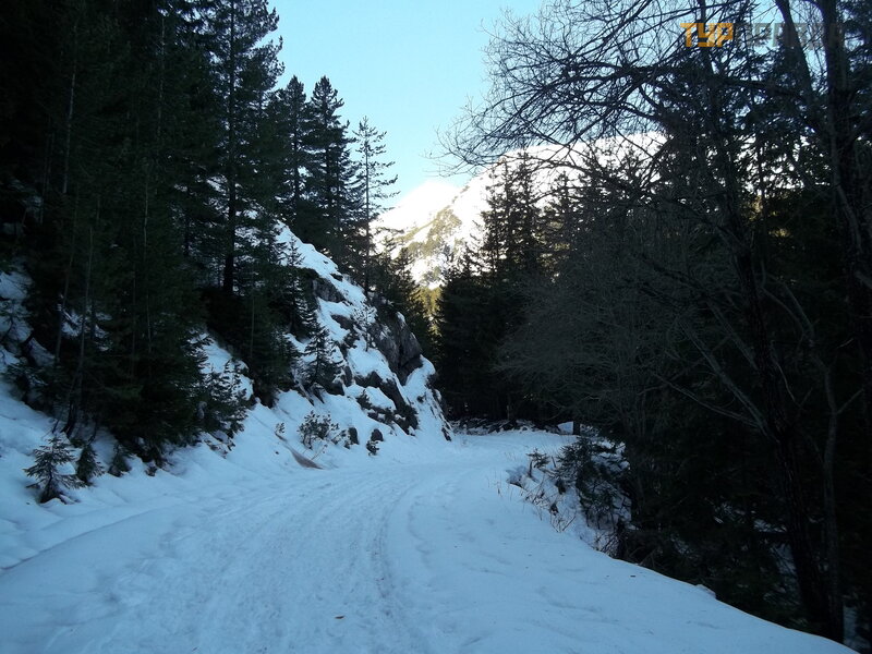 План прогулки у меня был, но все-таки сориентироваться помог один из инструкторов. Фактически, необледенелая дорога была одна. Сначала это был асфальт. Приятно было ловить каждый лучик солнца, потому что чувствовался утренний мороз:
