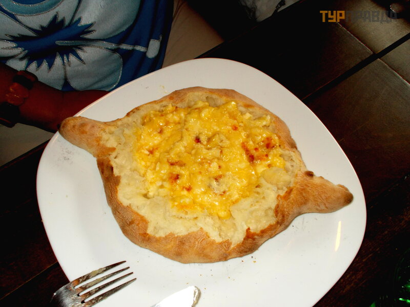 And then there was Batumi. . . He met us with his best achievement (as it seemed to us, hungry and chilled) - Adjarian khachapuri, they are also adjaruli (7 lari per dish). I didn’t have time to capture the beauty itself, because the aroma simply drove me crazy, and when I came to my senses, the main feature of this dish was lost - the egg, which is placed in the very middle of this yummy, had already managed to be mixed with the filling. But it still looks recognizable. I admit honestly, I did not master it, and this is only the smallest portion). There are legends about Georgian heroes who can master a portion of the Titanic in one sitting...