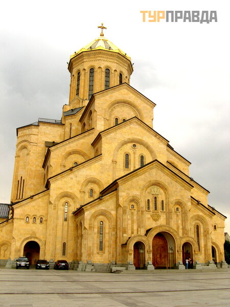 The heat began to subside at about 5 pm and we, a purely female company, decided to take a walk “for color” along the quiet residential streets of the city. Yes, to be honest, you pass by the male companies of local residents as if under X-rays, but! no exclamations, vile jokes or harassment in the spirit of “wah, beauty, let's go, you will be a wife! ” was not in sight. Through steep streets we climbed the mountain and came out from the back moan to Sameba, the Cathedral of the Holy Trinity. The scale is impressive, what can I tell you. . . Light rain added coolness and special effects to the sky.