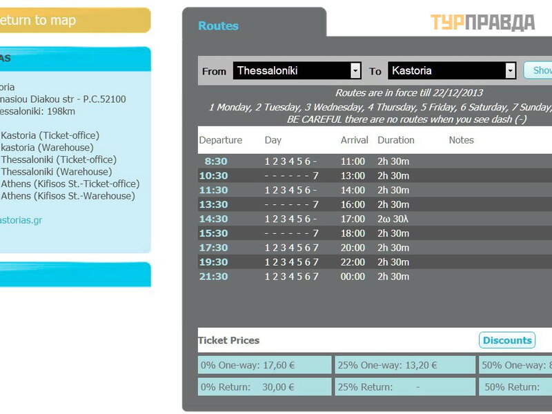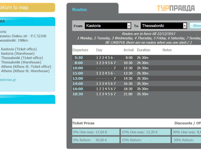 From the hotel in the area of Halkidiki and Thessaloniki, you will also need to take any bus that goes to this bus station or directly to Kastoria. They go quite often and it is not a problem to find a stop on the road. The roads in Greece are good, the buses are comfortable. But they are still buses. I do not recommend using an official taxi for such a move. The price will be outrageous.