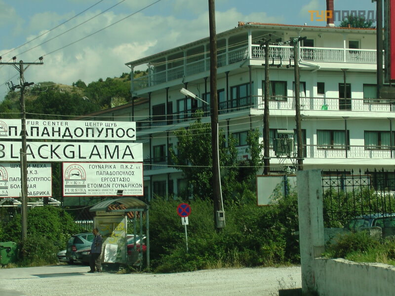 Then, after leaving this settlement, after a couple of kilometers you will drive up to the Limneon and Tsamis hotels and the second cluster of factories and fur salons located around them at a distance of 500 meters on both sides of the road. It is with him that I would advise you to start your trip to fur salons. After a couple of kilometers you enter the town and driving along the street along the lake, turn your head to the left. You will see the last cluster of fur salons located on the first floors of buildings.