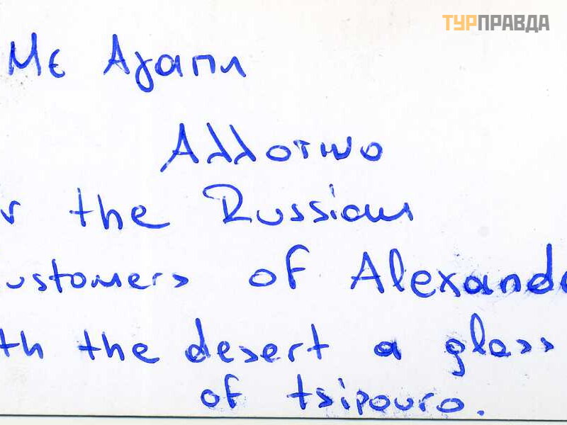 I suggested that he write any phrase on a business card, showing a scan of which any visitor could count on a bottle of wine, a Greek salad or a delicious dessert of their choice as a gift.