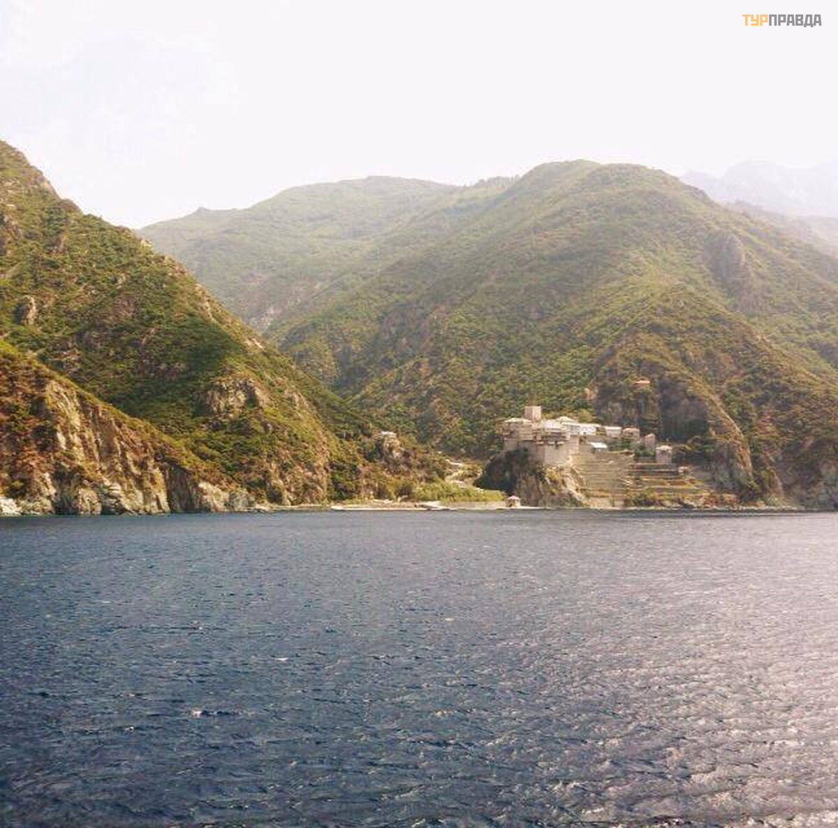 The ship was large, with three decks and a large selection of seats (open and closed, with sofas, soft seats, chairs and benches). There were bars on two decks where you could buy soft and alcoholic drinks, coffee, tea and snacks (pizza, sandwiches), there was also a souvenir shop on the ship, where, among other things, you could rent binoculars to view objects in the distance. We were met by the captains of the ship - friendly Andreas and Yorgos with the team. The departure was early on the 10th, and we headed towards the southern point of Athos. After two hours of pleasant sailing, we saw the majestically protruding Holy Mount Athos (height - 2033 meters), then the ship turned to starboard and went along the western coast of the peninsula. Cruise guests could watch 8 of the 20 monasteries, the main port of Athos - Daphni (so named because of the laurel trees) and listen to a story about each of the monasteries and the history of Athos in general.