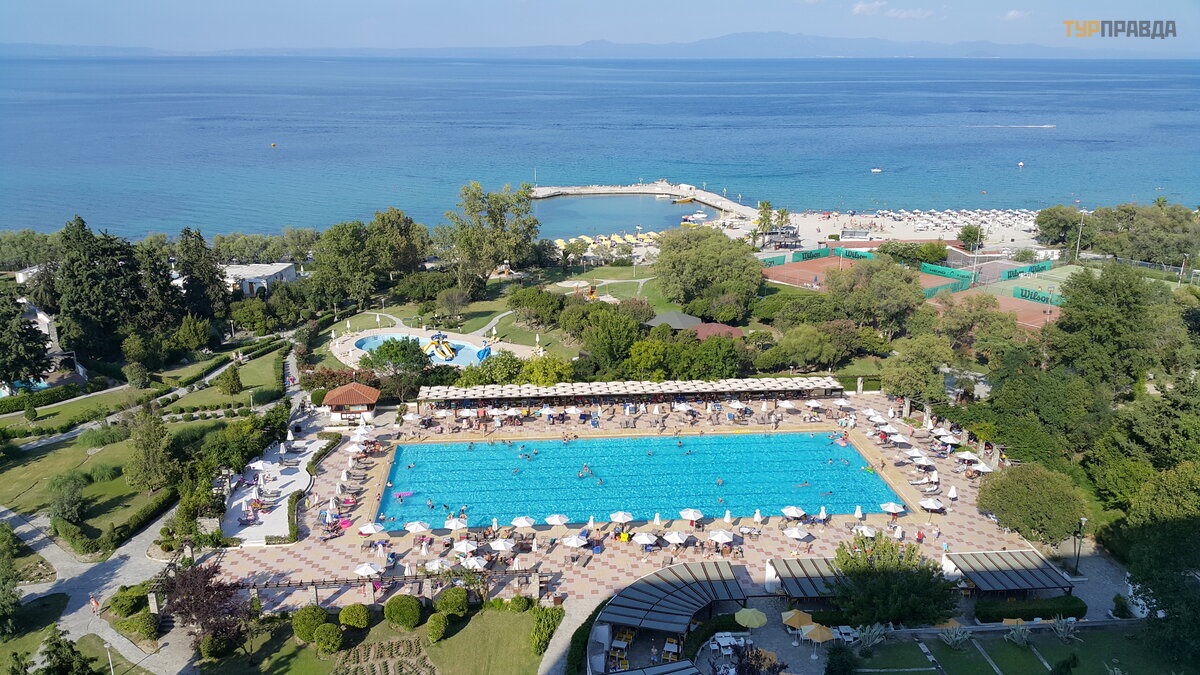 The hotel was chosen for a long time. I wanted the golden mean. And so that the fur coat remains and rest decently. As a result, I booked via the Internet for 12 nights a double room at the Athos Palace 4 * hotel with a sea view and all-inclusive meals for two adults and a teenager for 145.000 rubles.