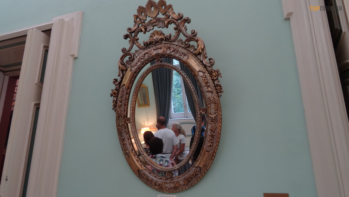 Looking into the mirror in which the empress herself looked, everyone looked in and giggled, each thought about his own. We walked around the park