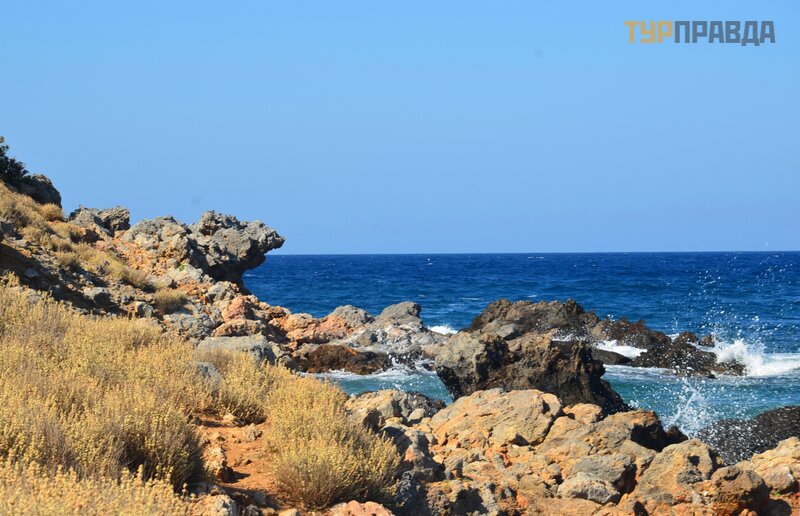 Georgioupolis is surrounded by beautiful beaches. On the one hand, stretching for 10 km towards Rethymno, a wide sandy beach. But at the time of our visit there was a high wave, so we chose the beach on the other side of the town, located between the rivers Gria Vlychada and Almyros. The springs and water of the rivers flowing here mix with sea water and create an unusual whirlpool of cold and warm currents. The water here is not so salty.