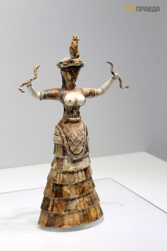 …objects of worship, the most famous of which are faience figurines of the Goddess with snakes from the temple in the Palace of Knossos. It is believed that the creature of the cat family on the head of one of the goddesses symbolizes dominance over nature.