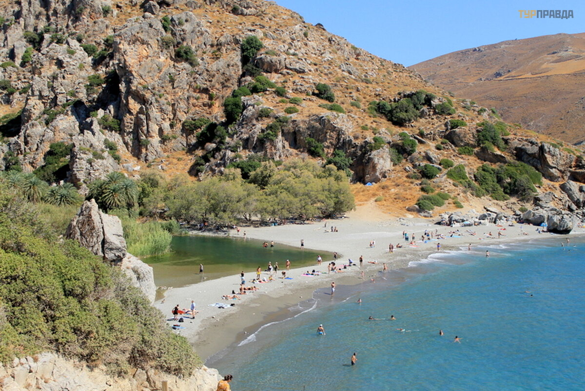 Another feature of the Palm Beach is that Mega Potamos, which brings its waters here, forms a small lake Limni Preveli (“limni” means “lake”), and therefore you can take water procedures like in the sea…