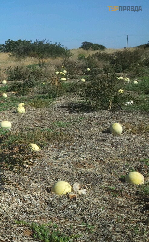 On the way to the main road, we came across dry fields with strange round vegetables the size of a soccer ball, something like a pumpkin, but not a pumpkin. We stopped - so it's a watermelon! Whether this is the variety, or the remains of illiquid assets in the fields, it does not matter. But the children learned the word "melon".