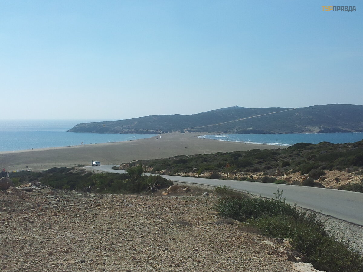 The next point of our visit was Monolithos Castle. The road is smooth and unremarkable. On the right - mountain landscapes, on the left - beautiful deserted beaches. We walked a little along one of these.