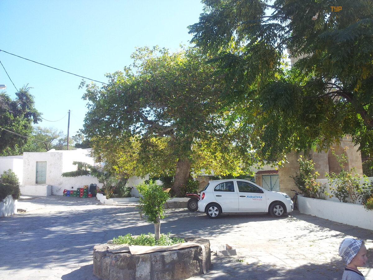 For starters, we went to the south of the island. On the way we turned to the village of Vathi. We meandered along the narrow streets, everyone was afraid - and if there is an oncoming car, then how? It worked))) We got to the advertised Platanos tavern. It was about 10 am, there was no one, only a lone plane tree. We walked around the church, and back to our route.
