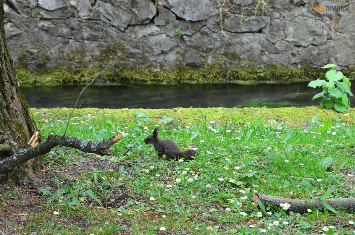 Barlangfü rd baths? located in a park with a small pond where a swan swam alone. Emboldened squirrels ran among the trees.