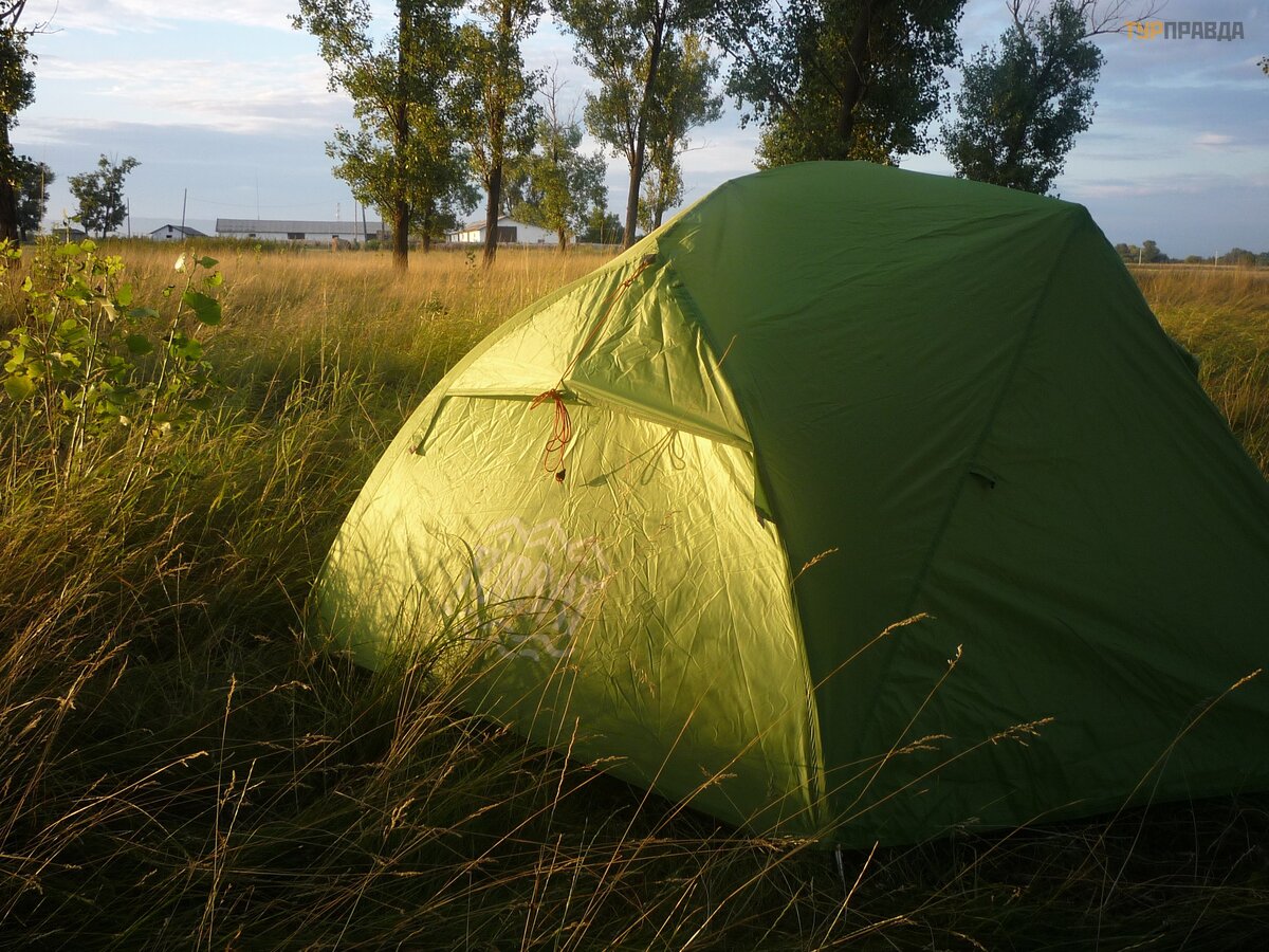 We set up a camp for the night in the middle of a field, hiding in the trees on the territory of a farm in a small town. Where in the distance one could see a mountain landscape with a wonderful sunset.