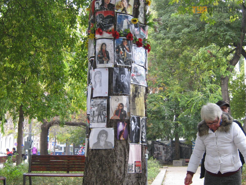 The tree in front of the hotel is a place of pilgrimage for fans. They say that Michael Jackson was smoking near him. And this woman takes care of this place